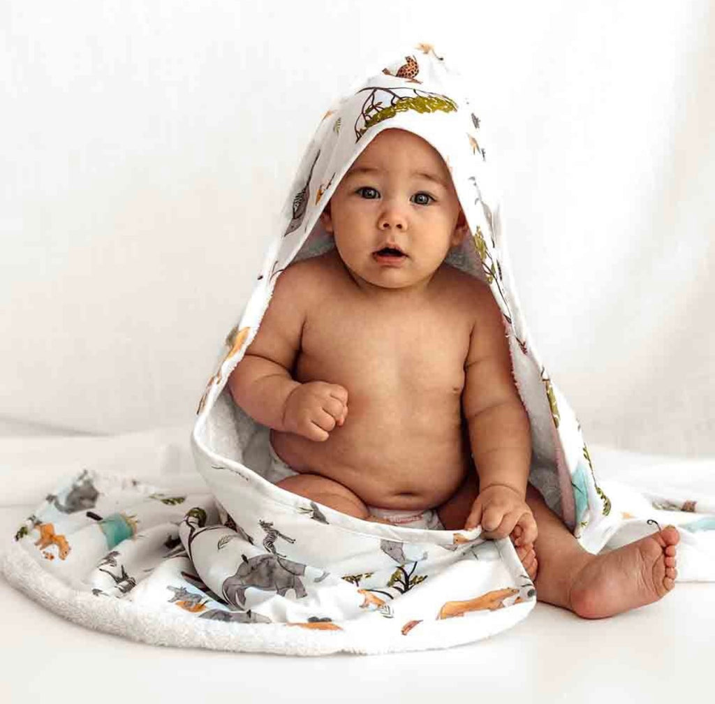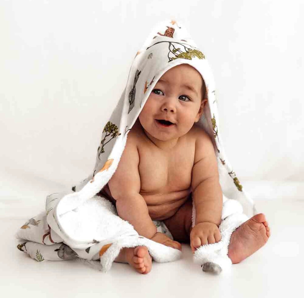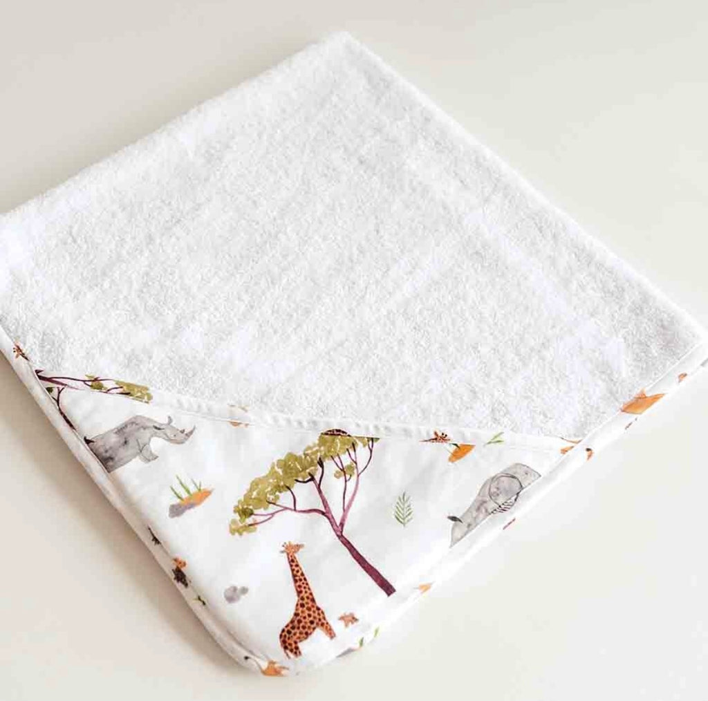 We have designed these unique towels with jersey organic cotton on one side and organic terry towelling on the other side. The jersey side features our exclusive Snuggle Hunny Safari print. The towel is an extra large 90cm x 90cm so ideal for babies through to toddlers.