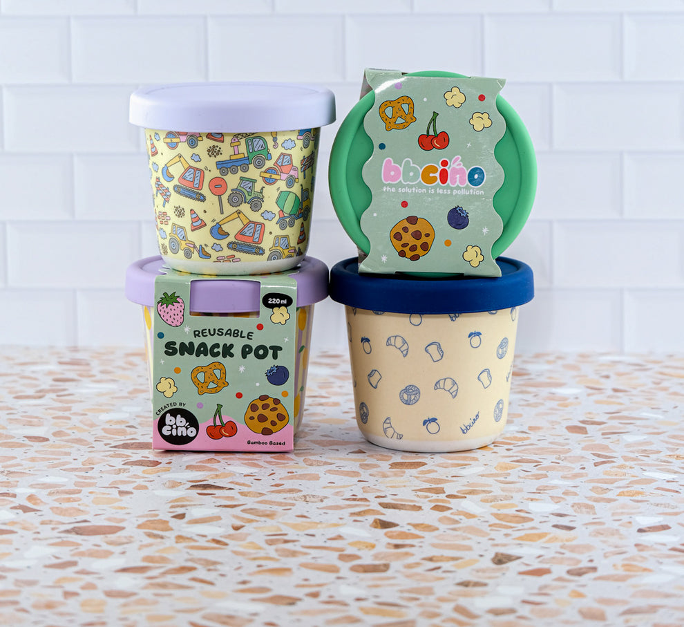 OUR REUSABLE BAMBOO SNACK POTS ARE THE PERFECT ALTERNATIVE TO PLASTIC THROWAWAY CONTAINERS. CRAFTED FROM SUSTAINABLY SOURCED BAMBOO AND TOPPED WITH A SOFT SILICONE LID, THEY’RE LIGHTWEIGHT, DURABLE, AND LEAK-RESISTANT! IDEAL FOR LUNCHBOXES, SNACKS ON THE GO, OR STASHING LEFTOVERS. OUR REUSABLE SNACK POTS ARE PRACTICAL AND PLANET-FRIENDLY, MAKING THEM PERFECT FOR LITTLE HANDS AND BIG APPETITES!
