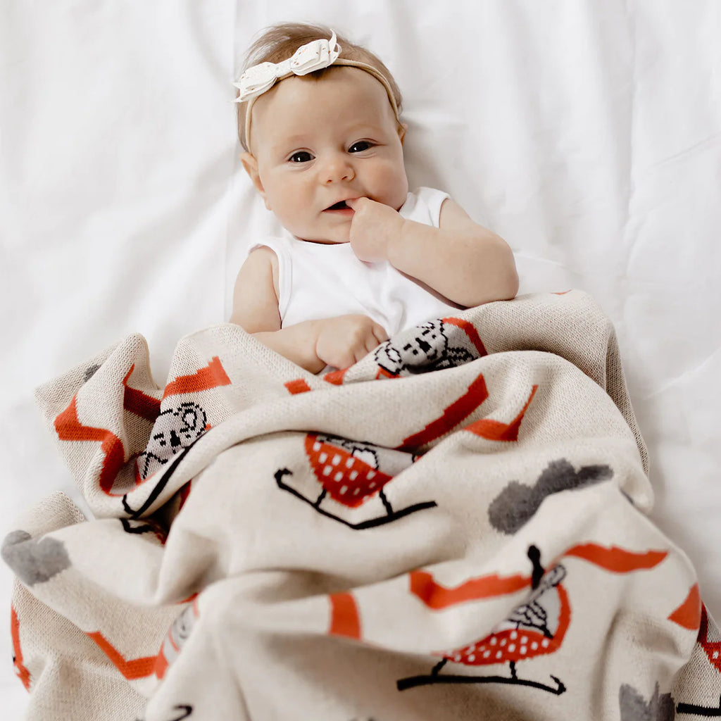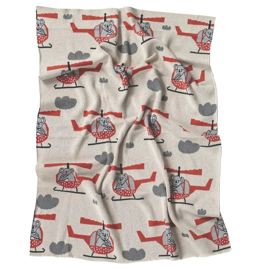 This gender neutral blanket features cute koalas in helicopters. Made from 100% cotton, it is perfect for gifting or for your newborn’s nursery.