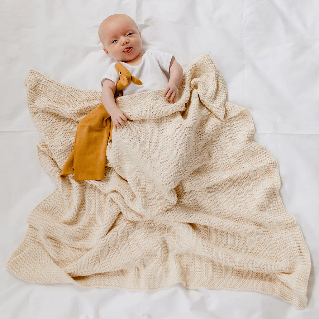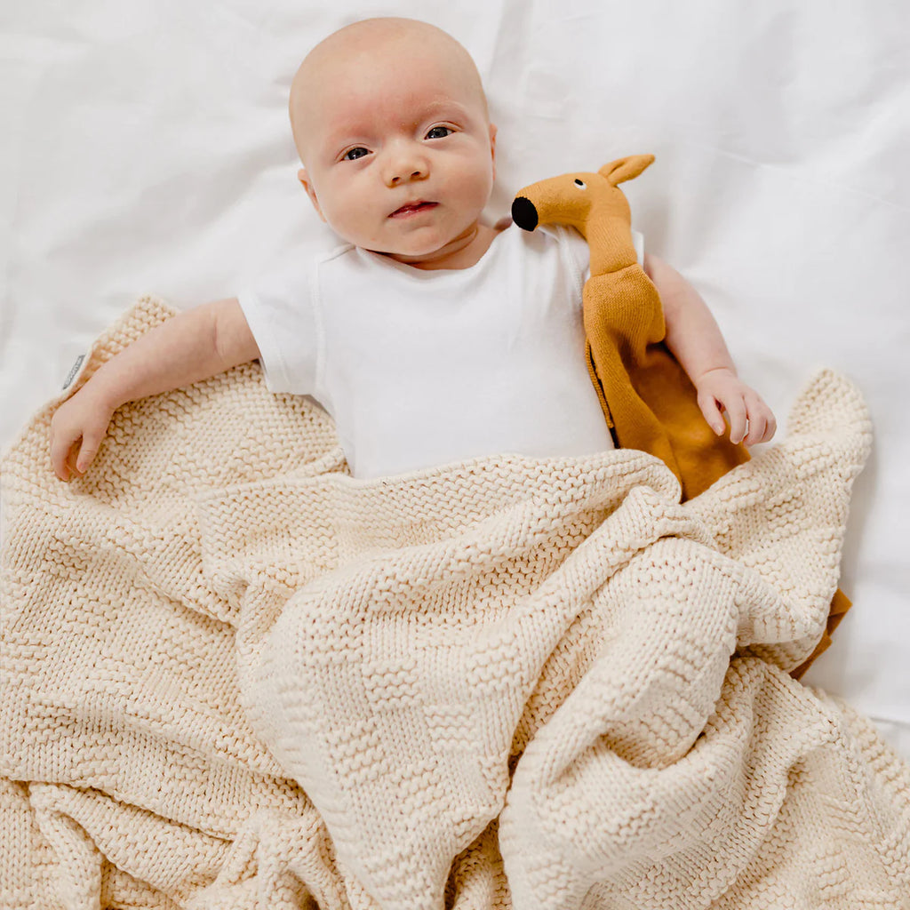 Freya blanket is knitted in a chunky design and comes in rust, mint, natural and nude. A beautiful blanket to keep bubba cosy in the winter months.