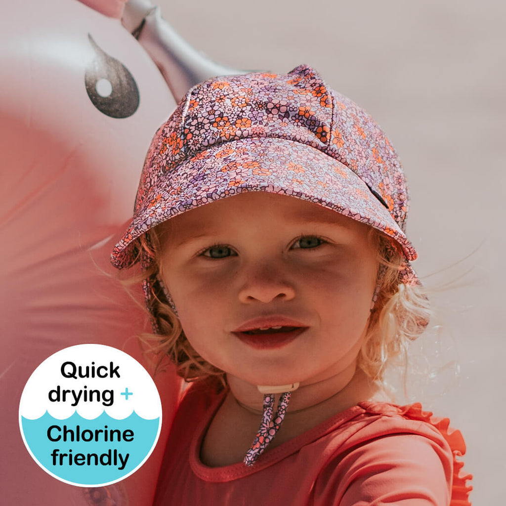 A mosaic of flowers in purples and pinks, this print will make the plainest of swimsuits pop! Try it with our Slate or Peach rash vest for a fresh colour combo. Available in Legionnaire, Ponytail Bucket, Ladies Swim Visor and Wet Bag.