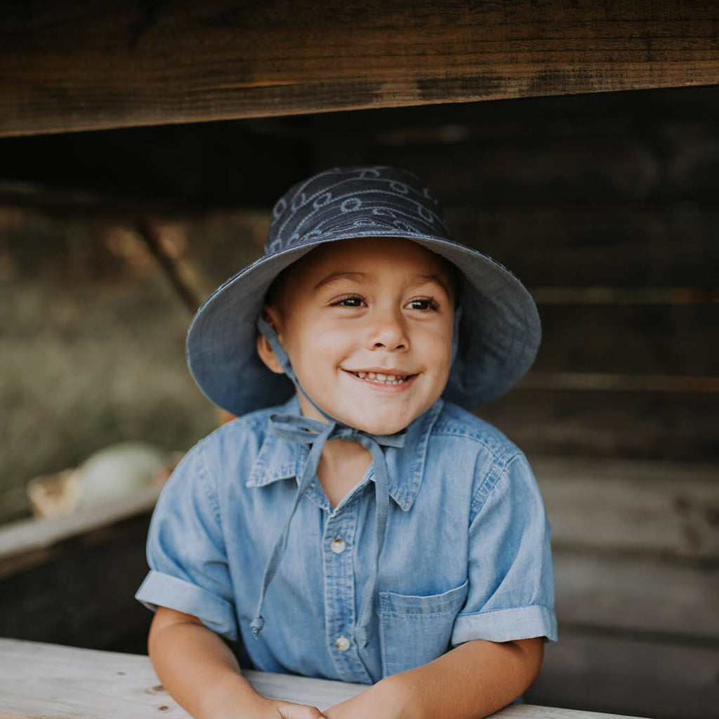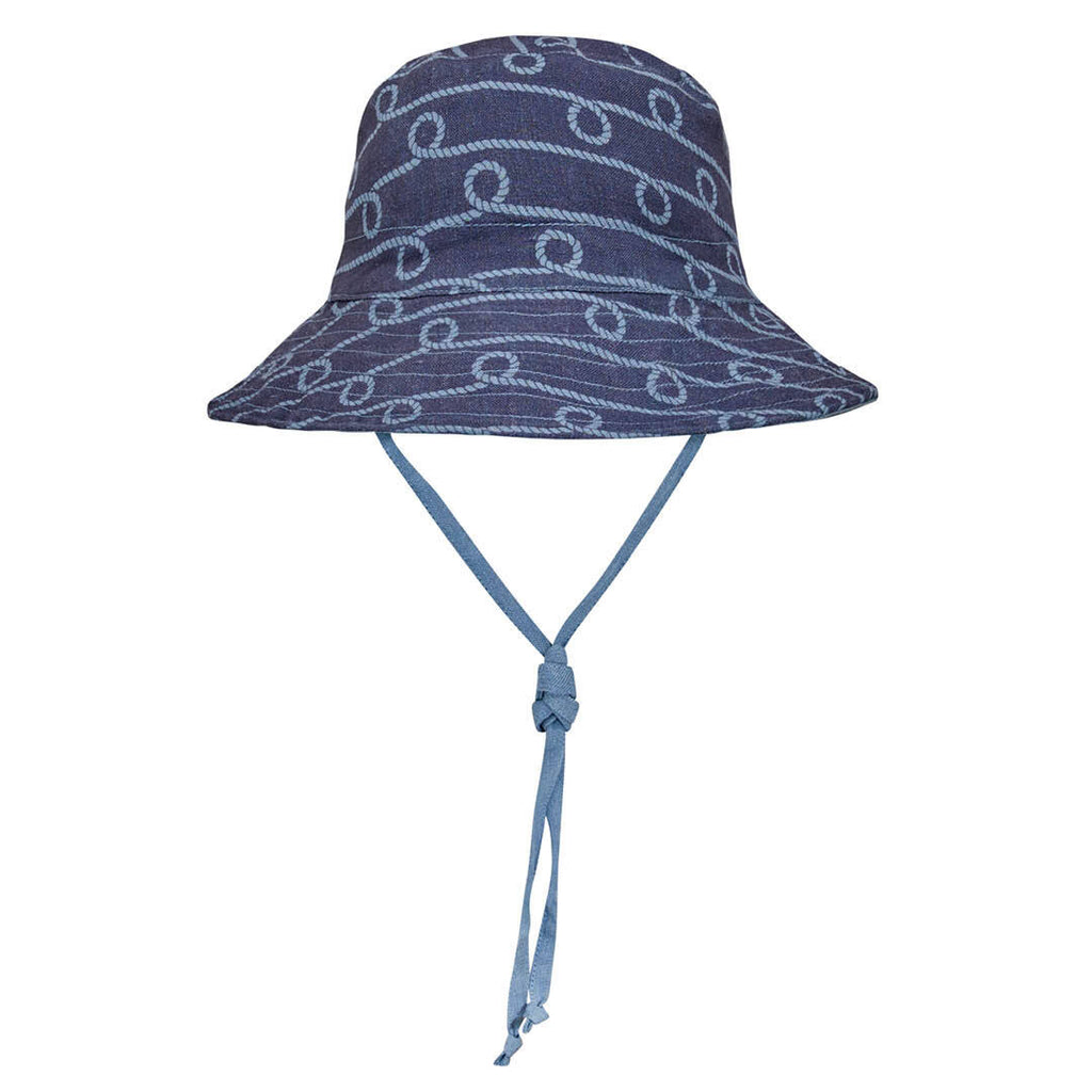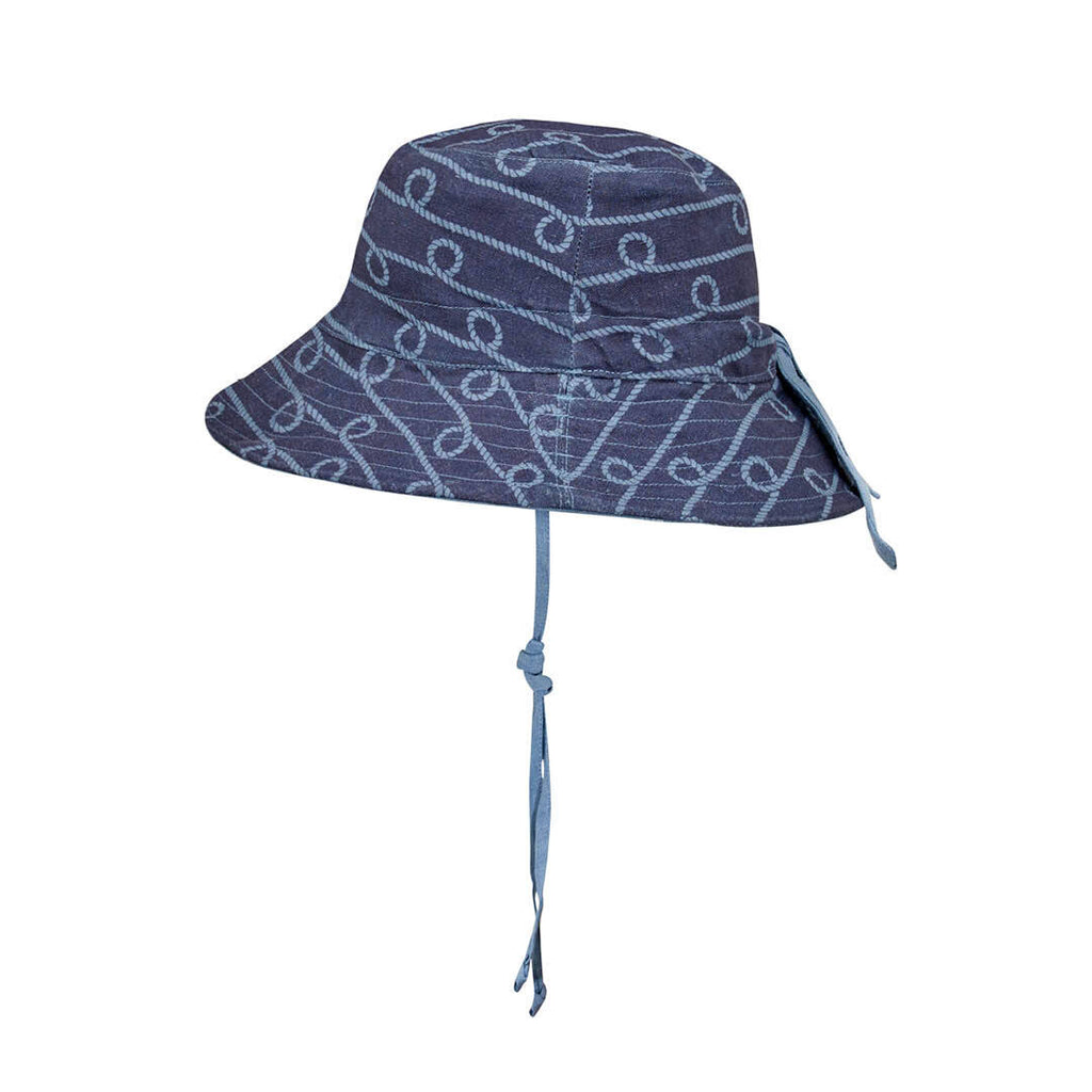 A little nautical, a little cool, these two beautiful blues work so well together! This swirled blue-grey rope stripes on a navy hat is the perfect match with denim and tans. Available in Baby Flap Hat and Classic Bucket.