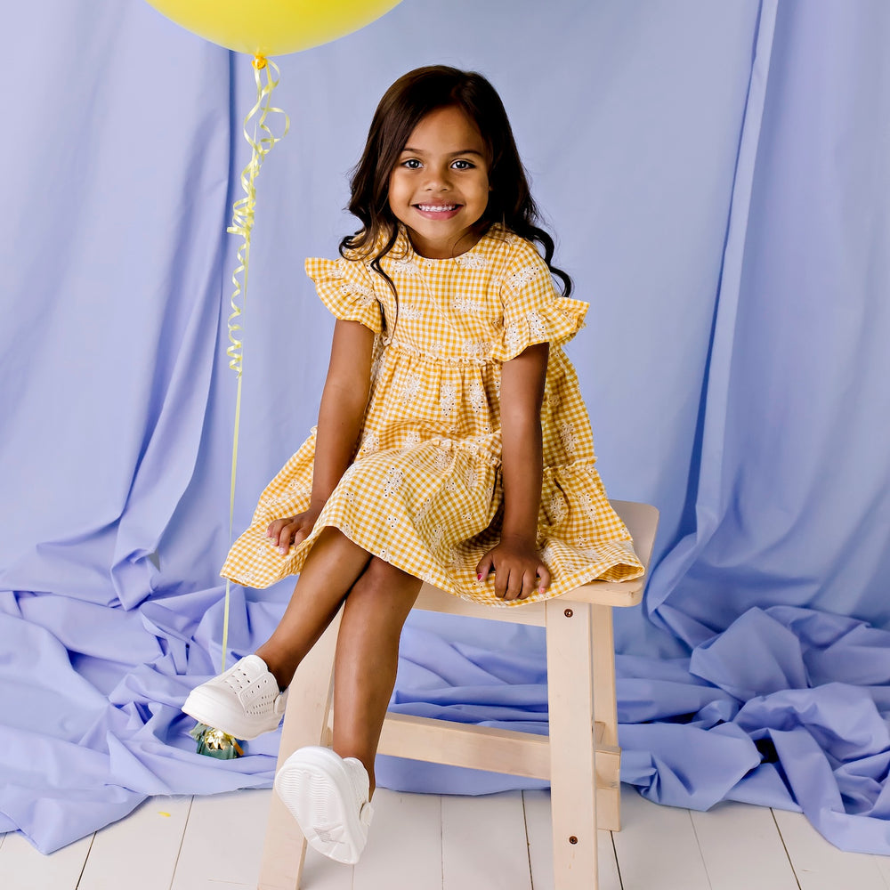 Get ready to turn heads in the Alice Embroidered Gingham Dress! This playful frock features charming embroidered details and a classic gingham pattern. Perfect for a sunny day out, this dress is sure to bring some fun to your girl's wardrobe.