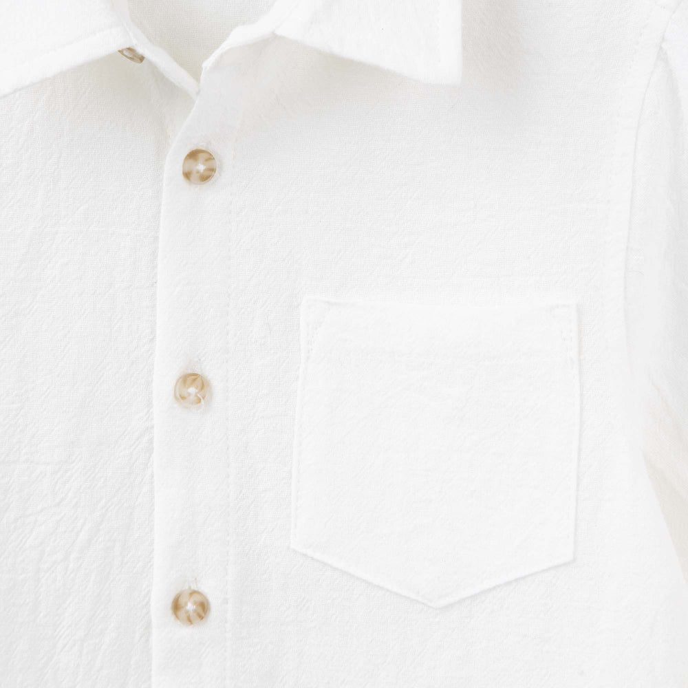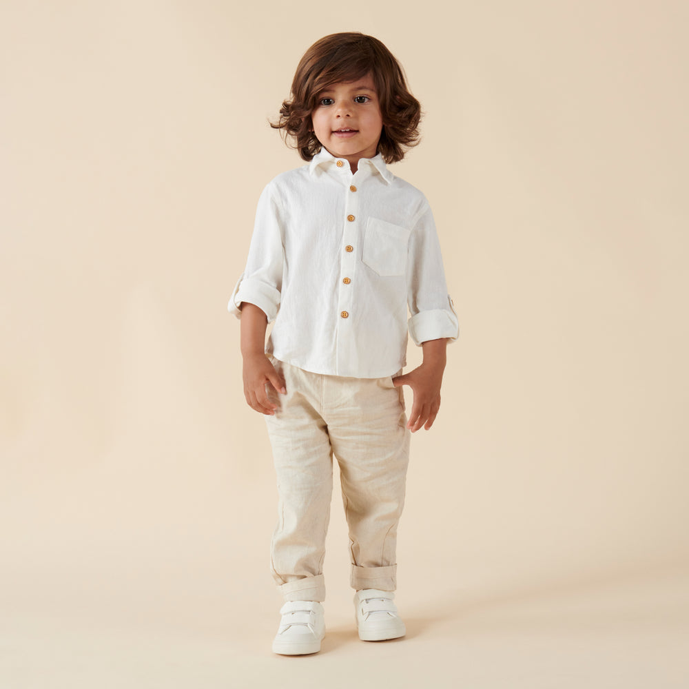 The Archie L/S Button Romper features a tailored collar, long sleeves, front button openings and a snap button closure at the base. Can be paired with the Finley Linen Shorts or Pants, bow tie and suspenders for the perfect special occasion look for your little man.
