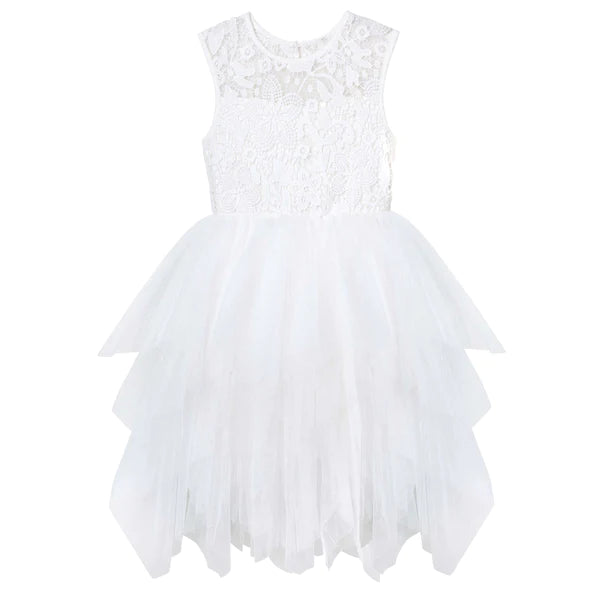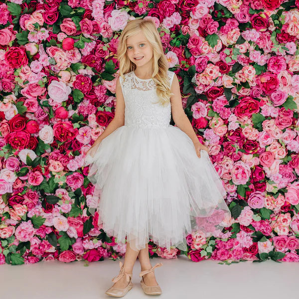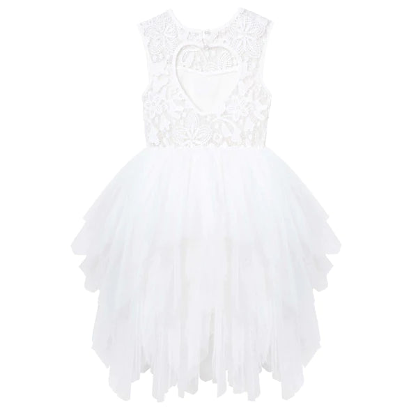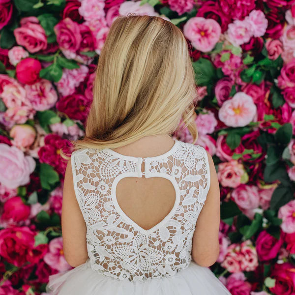 The drop-dead gorgeous Tara Heart Back Dress features floral lace bodice, several layers of flowing tiered tulle and a beautiful heart back cut out on the back. The perfect dress for your princess's next wedding, birthday party or special occasion!