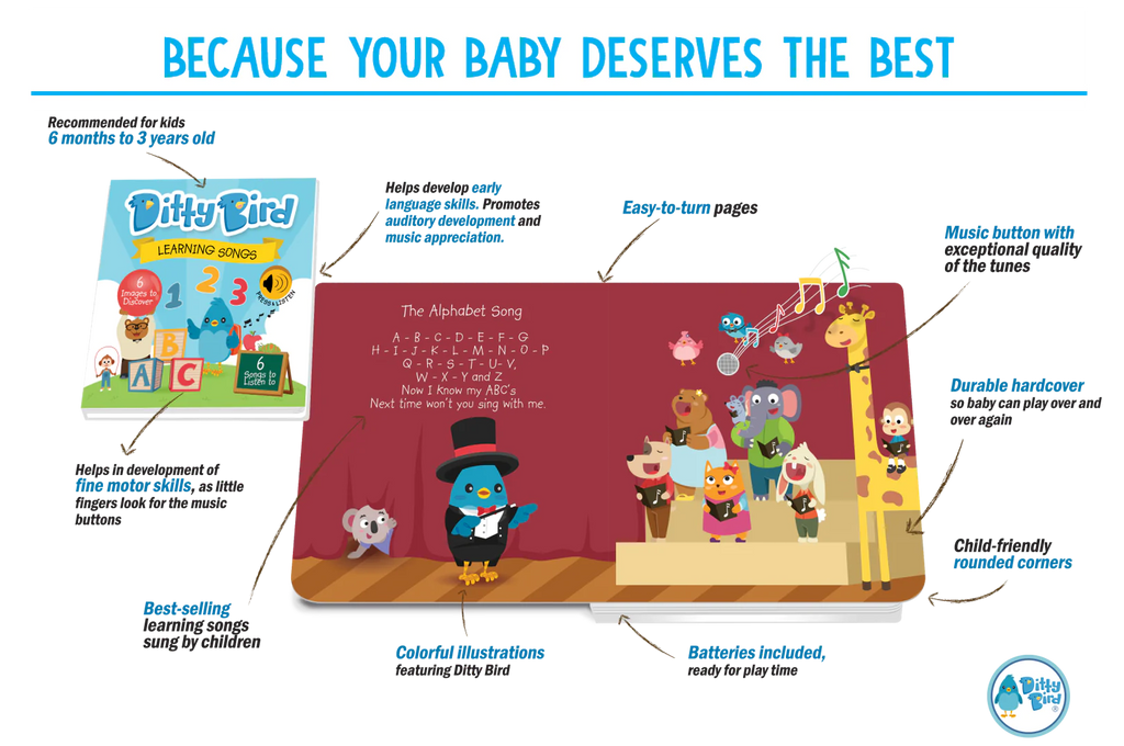 Read, listen, sing along as Ditty Bird sings easy to learn songs. The ”sound dot” on every page spread triggers one of the six popular learning songs, sung by children. The beautiful images will hold your baby’s attention even longer.