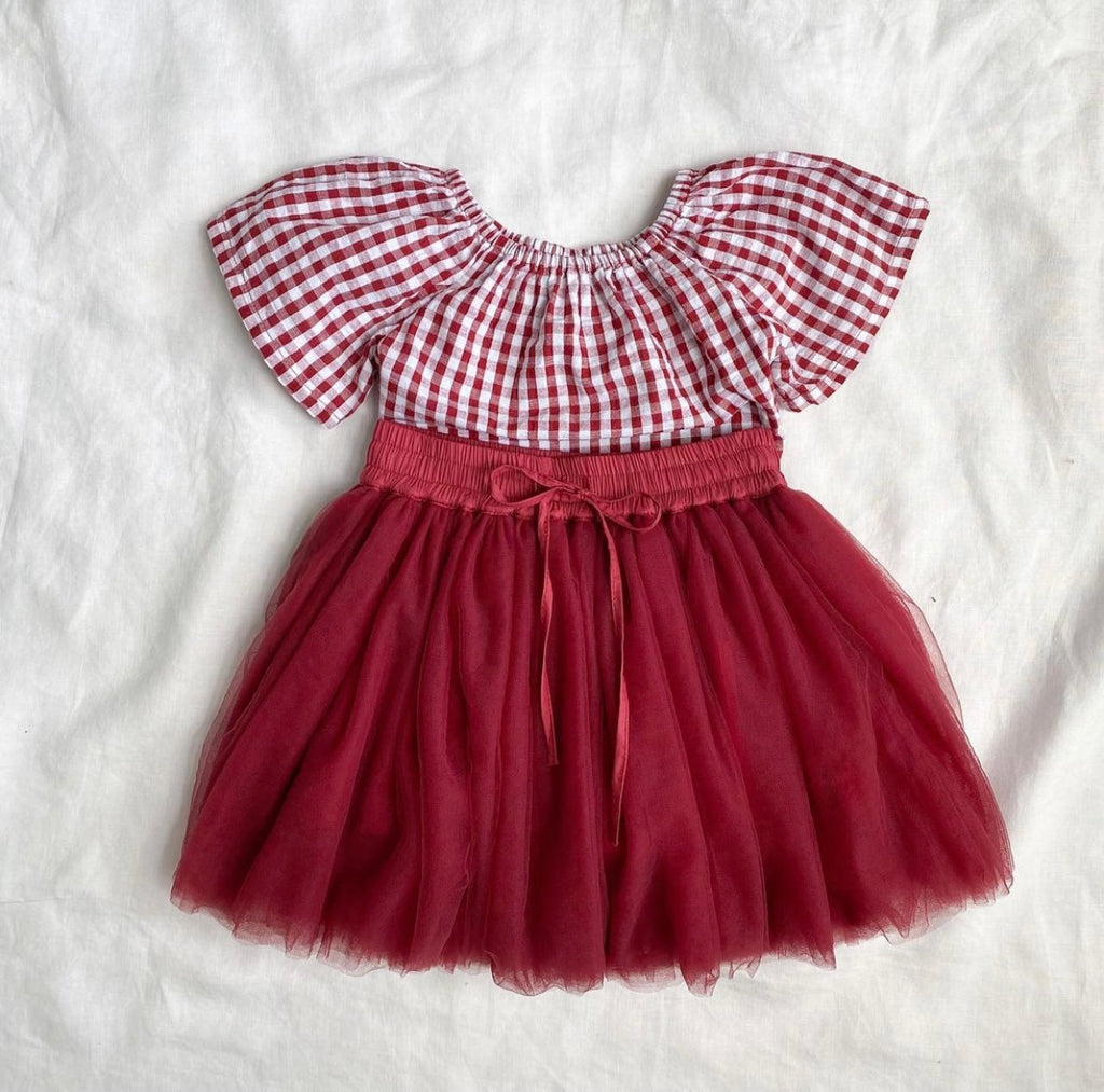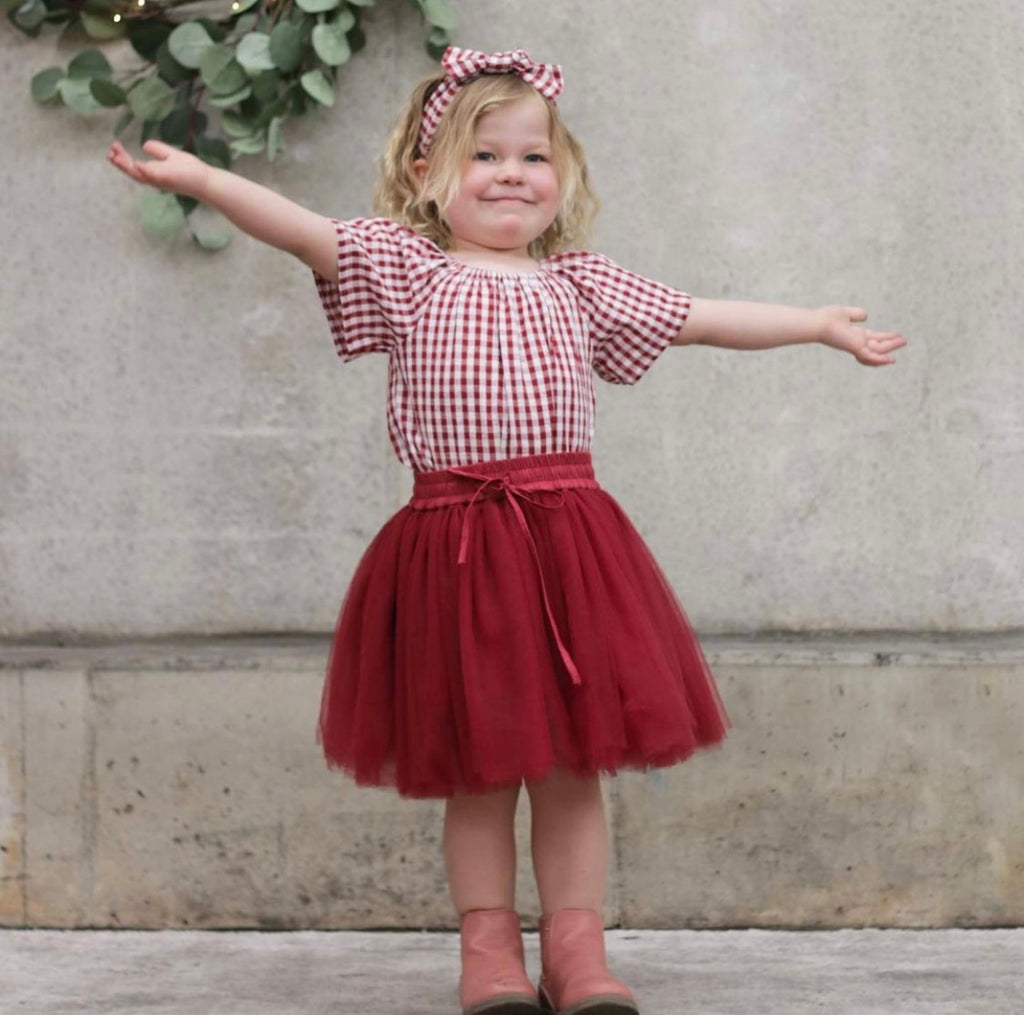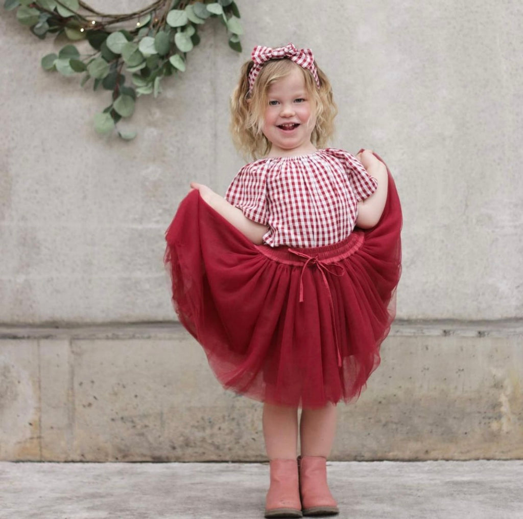 The 'Burgundy Red' Tutu is a soft full skirt with a functional drawstring and elastic waist. It is so adorable paired with the 'Christmas Red Gingham Top'!