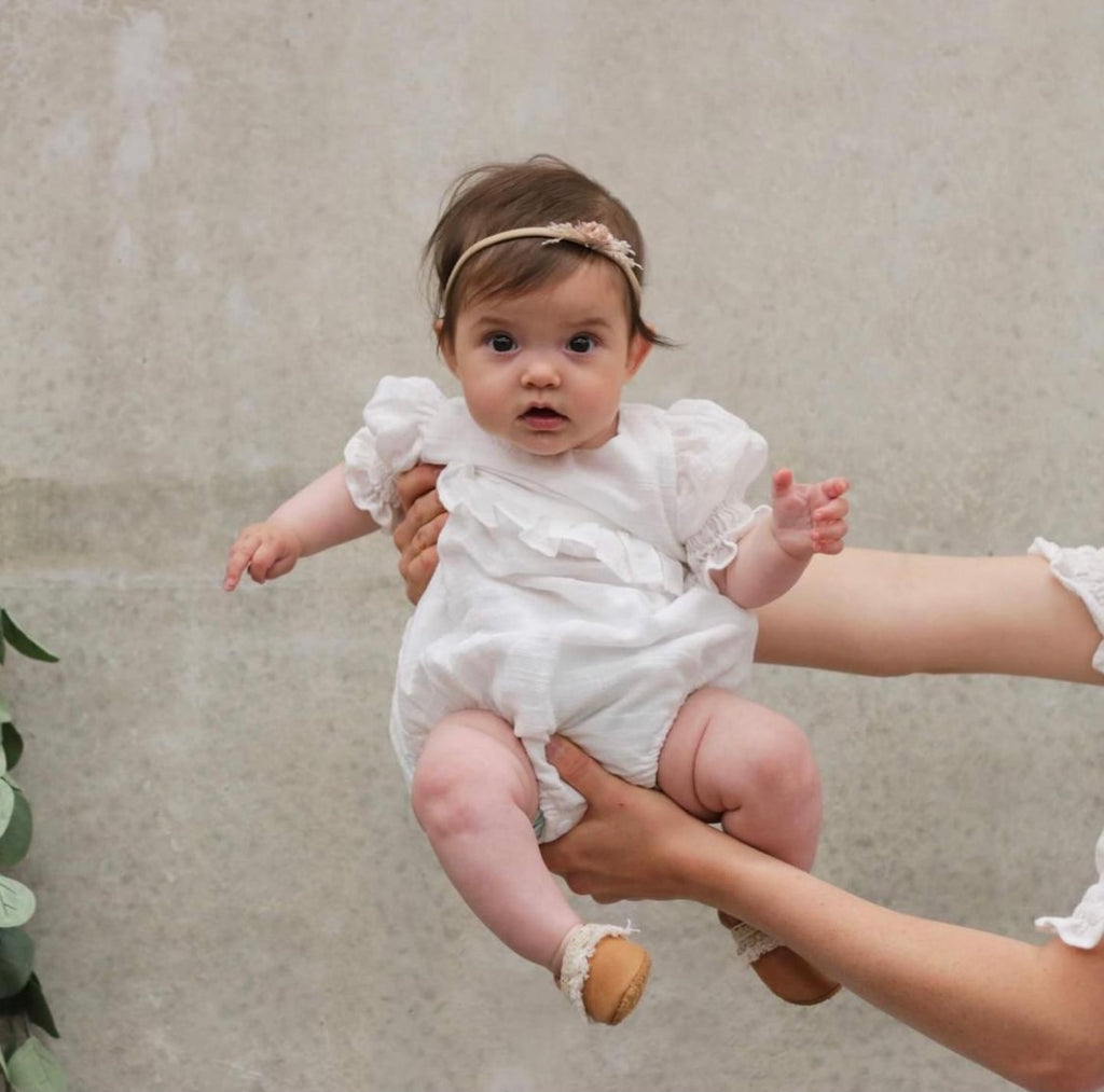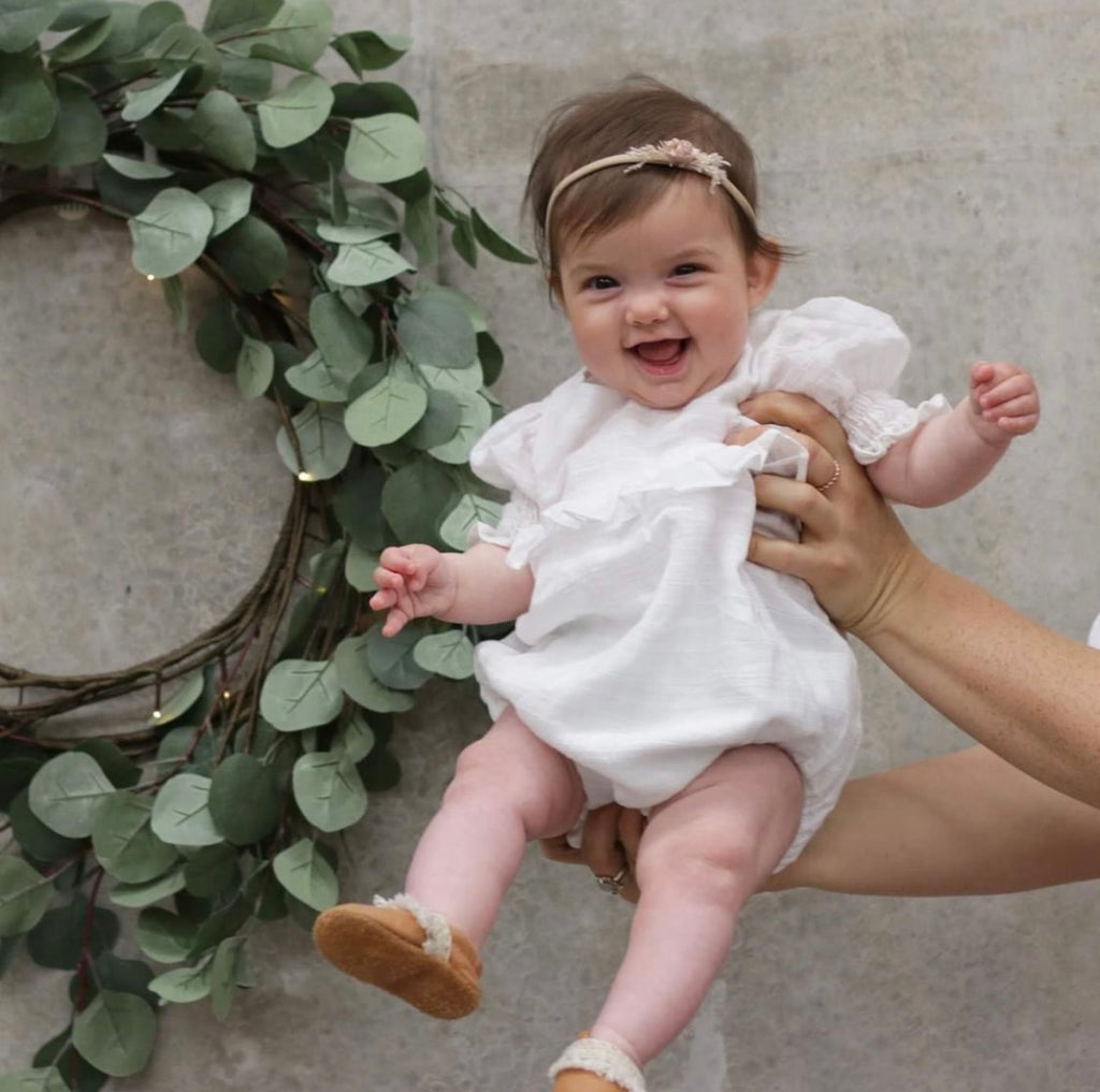 The 'Pearl Textured Cotton' Ruffle Playsuit is so precious! Featuring shirred sleeves, a sweet ruffle across the chest, and snaps at the neck and crotch to make Christmas Day changing easy.