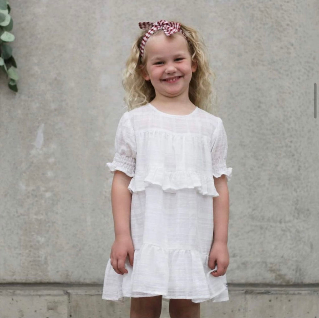 The kids 'Pearl Textured Cotton' Tiered Ruffle Dress is a sweet special occasion dress! Featuring shirred sleeves, ruffles and a button opening, it is so easy to wear.