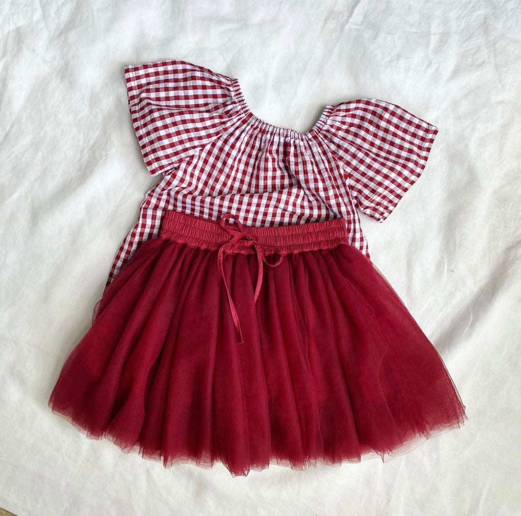 The 'Red Gingham Crop Top' features lovely wide sleeves and an elastic neckline so it's so easy to wear. Such a cute pairing with the tutu, overalls or curved shorts!