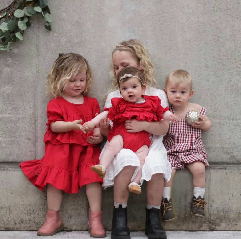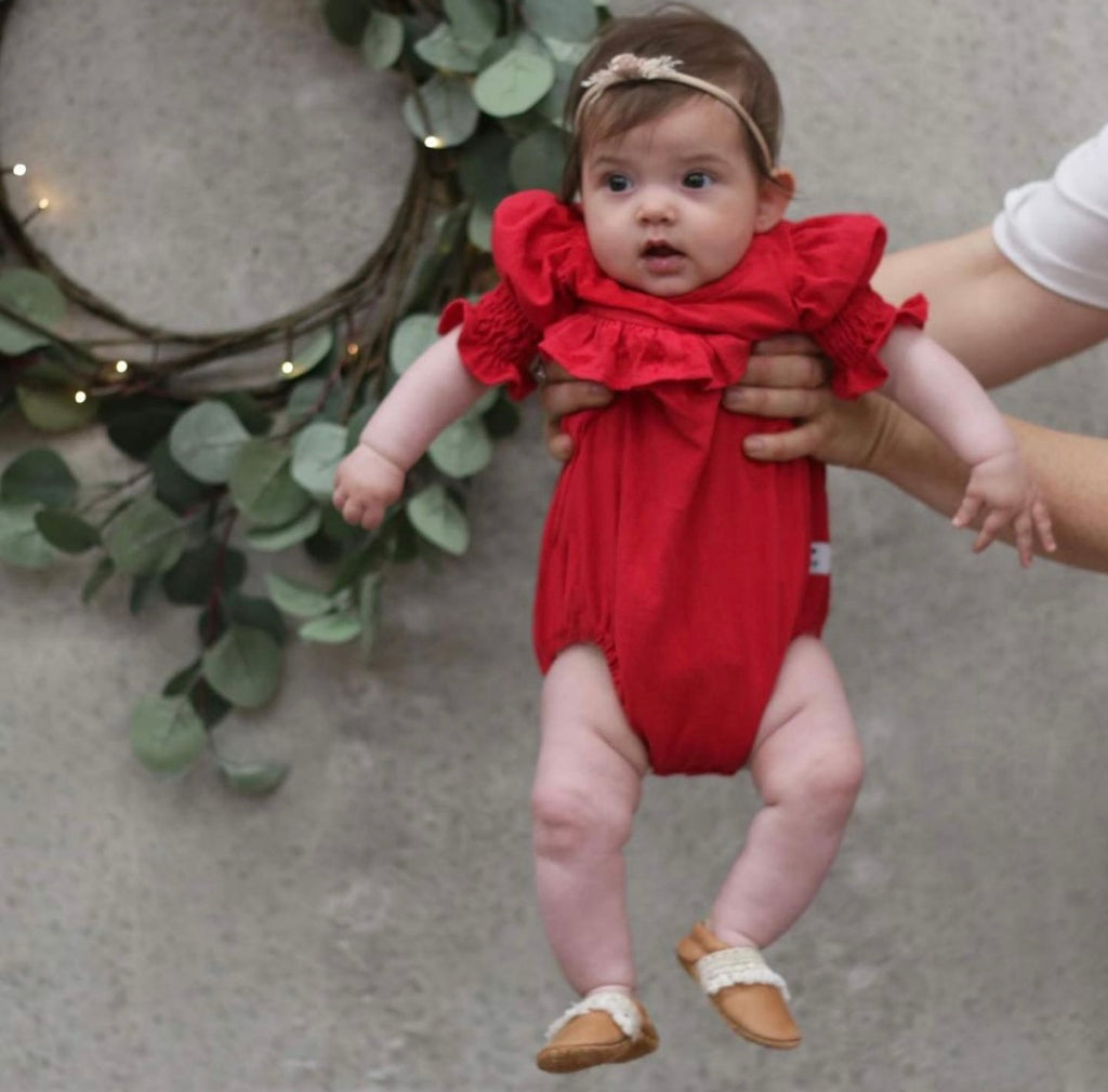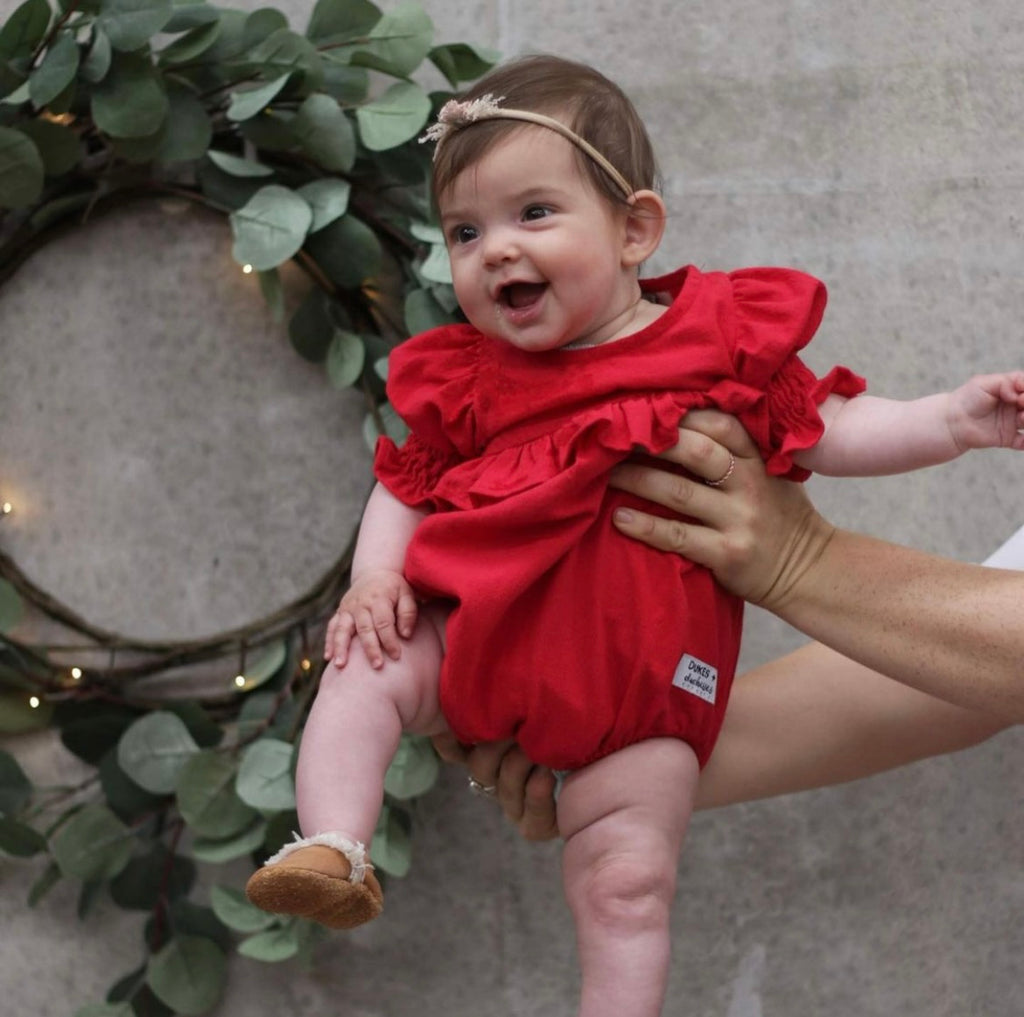 The 'Christmas Red' Ruffle Playsuit is so precious! Featuring shirred sleeves, a sweet ruffle across the chest, and snaps at the neck and crotch to make Christmas Day changing easy.