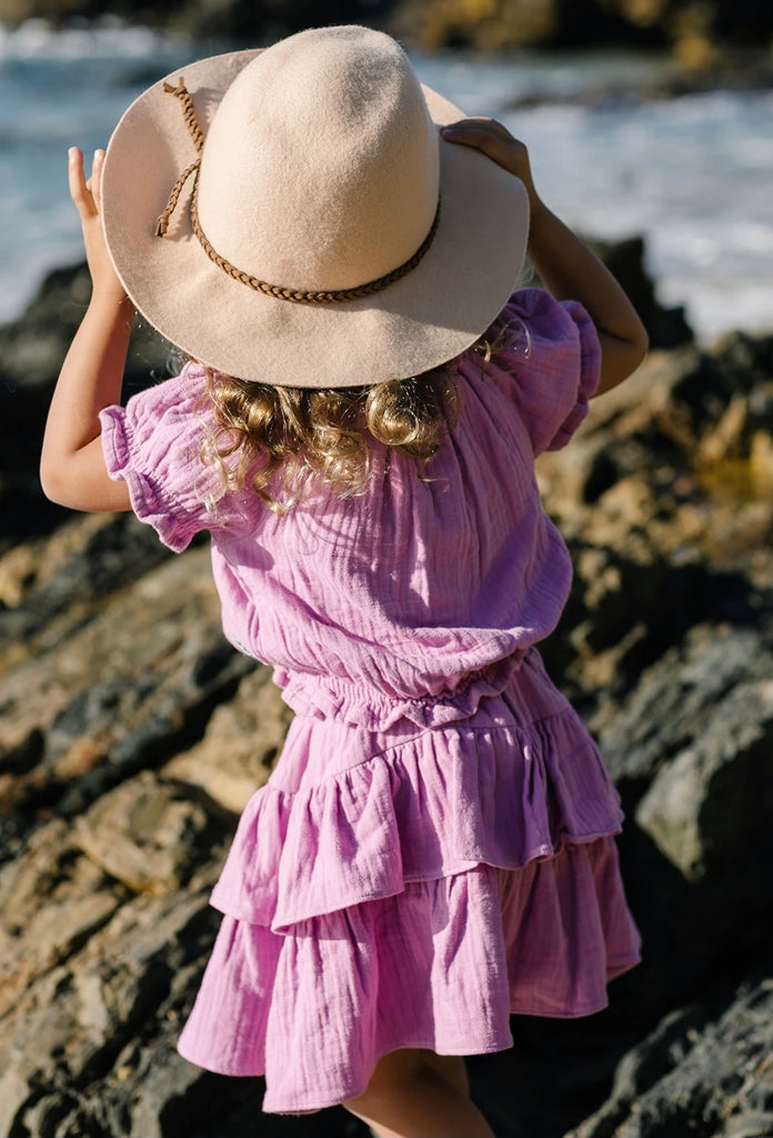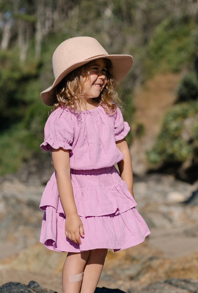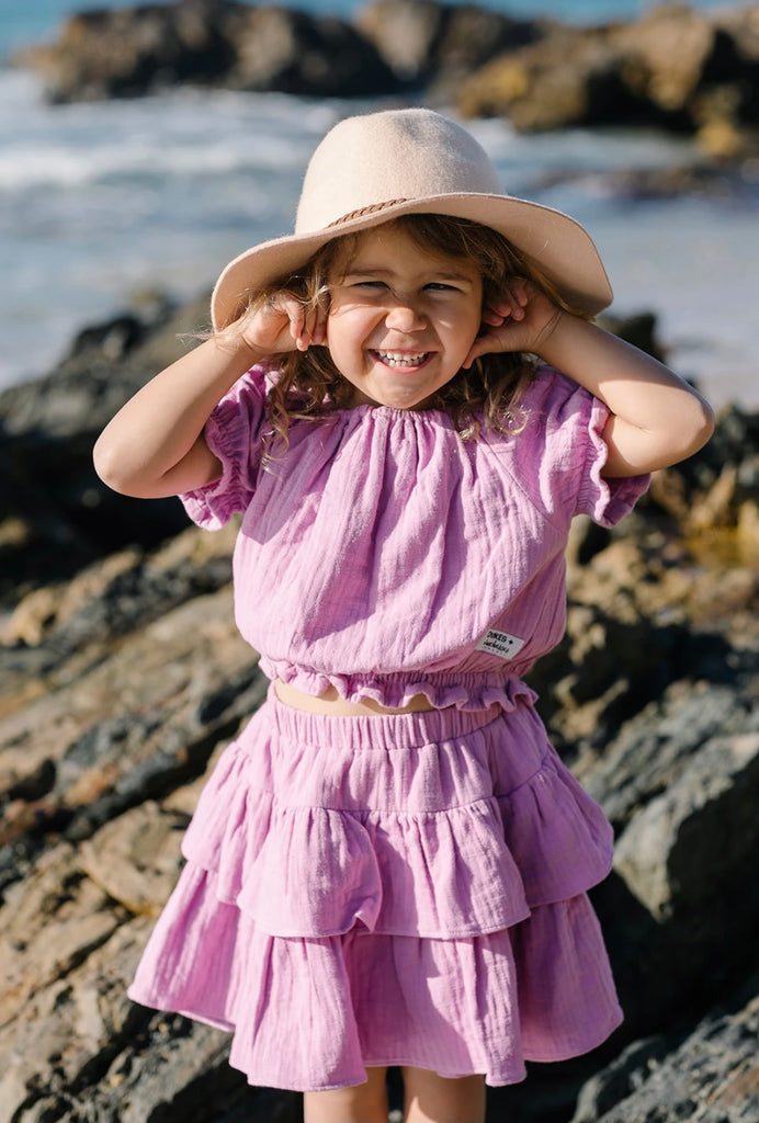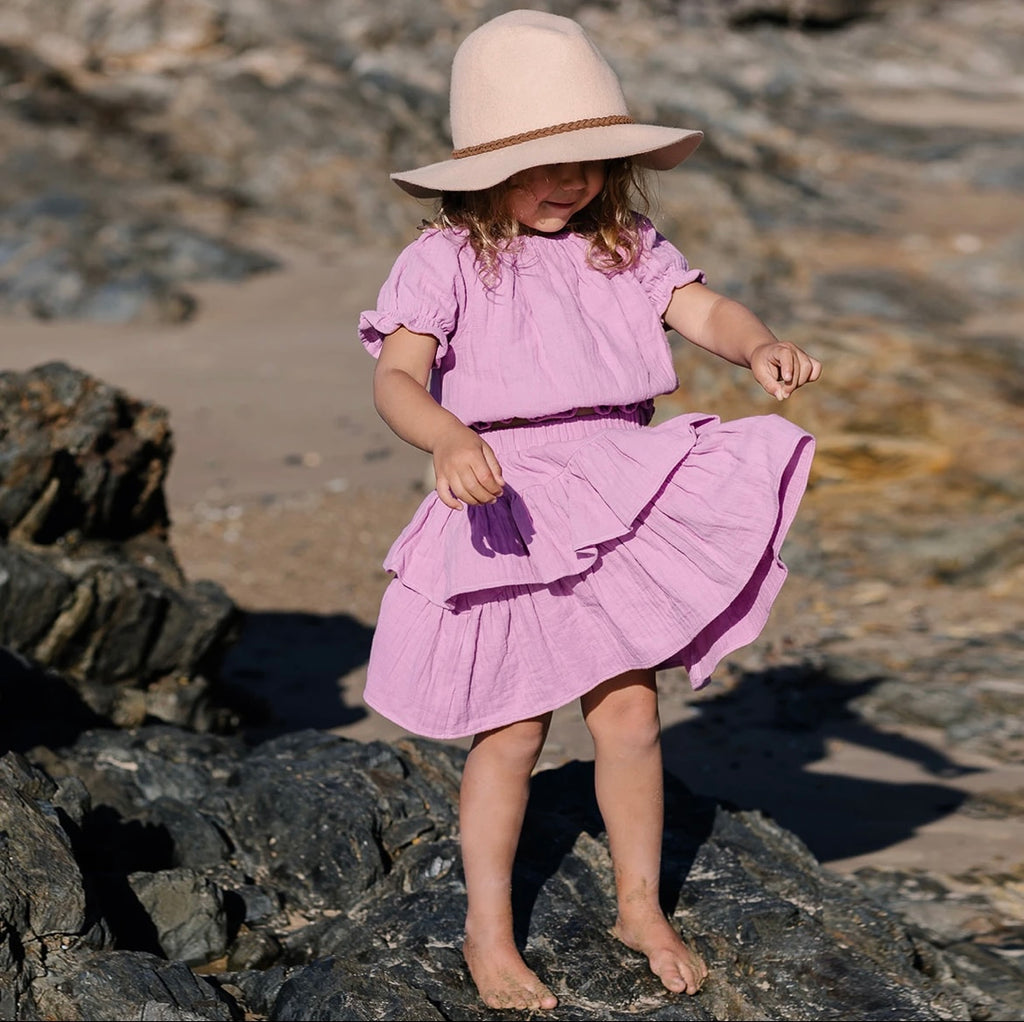 The 'Mulberry' Ruffle Skirt is so fun! It features a functional drawstring (so you can tighten / loosen as you need) and an elastic waist. Designed to sit above the knee and it looks so cute with its matching top.