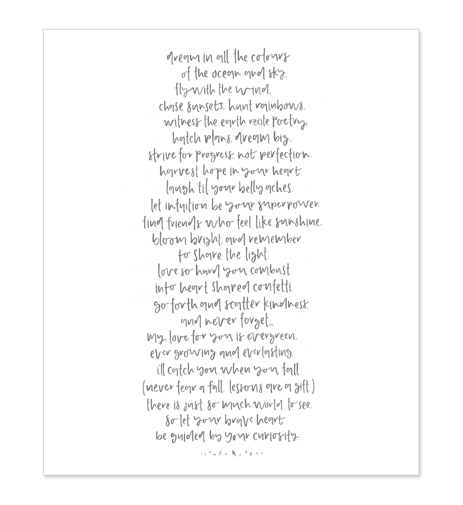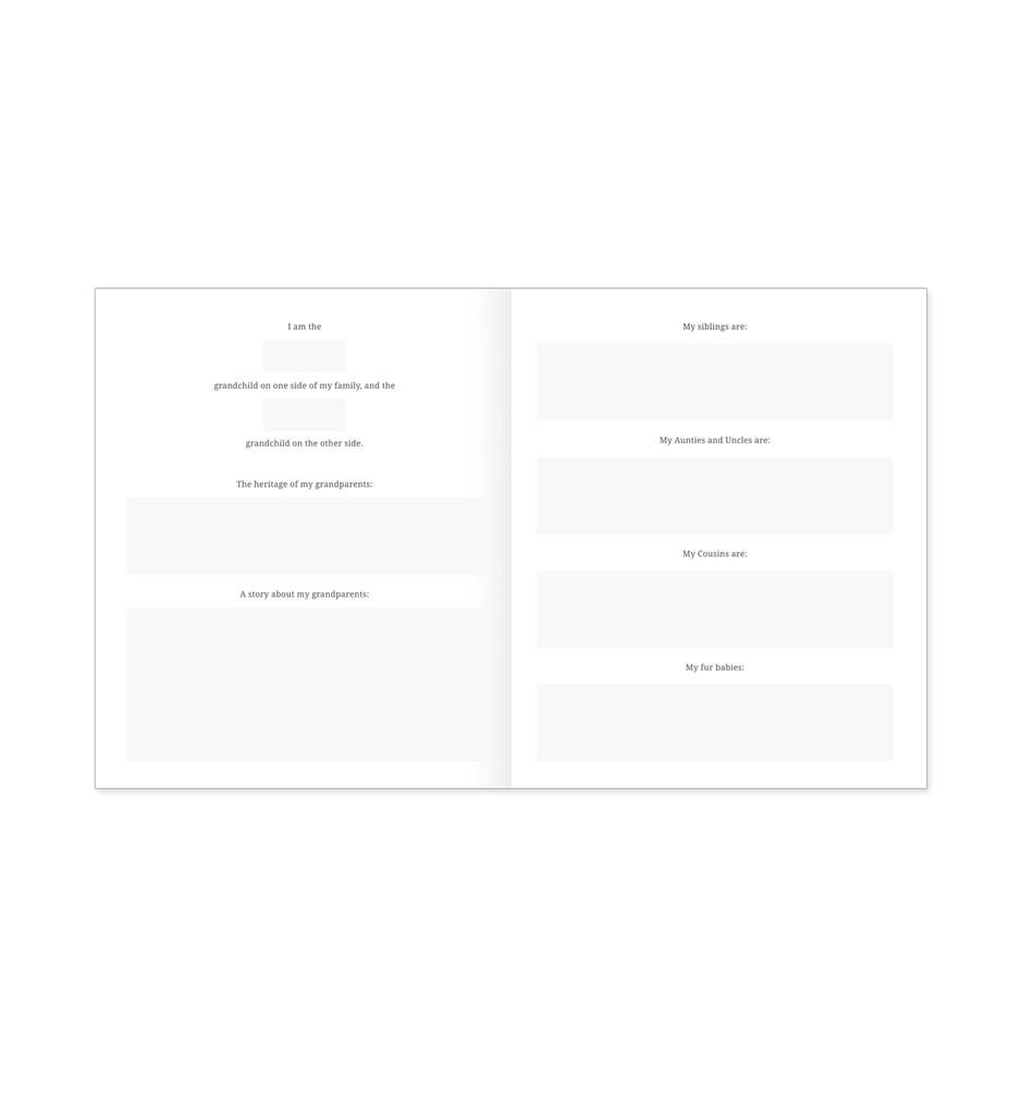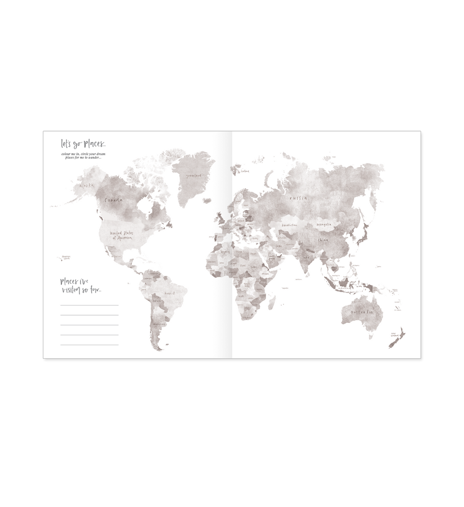 - Brush-lettered words, a poem, manifesto and bespoke illustrations throughout, including family tree and world map
