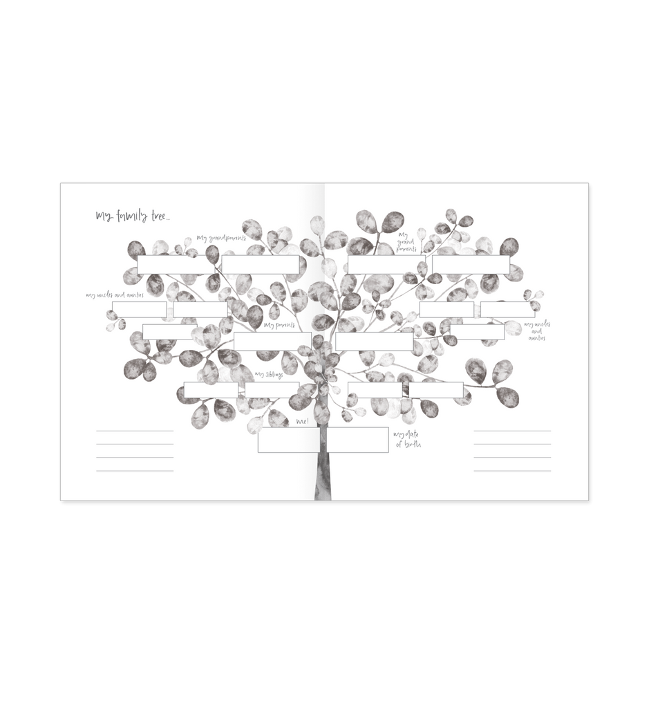 - Brush-lettered words, a poem, manifesto and bespoke illustrations throughout, including family tree and world map