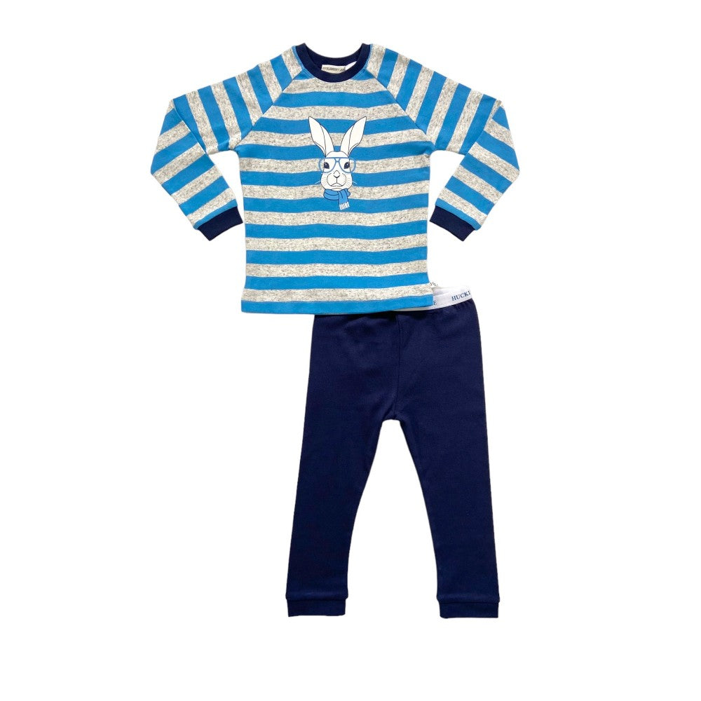 Featuring our super soft & comfortable Grey Marle & Bright Blue Striped Rib. Cute Bunny print across the chest. Navy Blue 100% cotton rib contrast trim for the added detail.