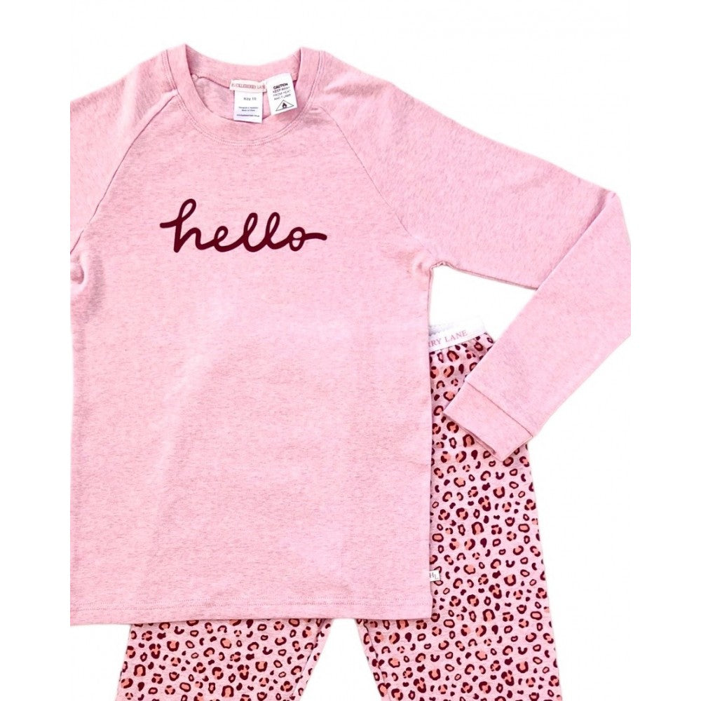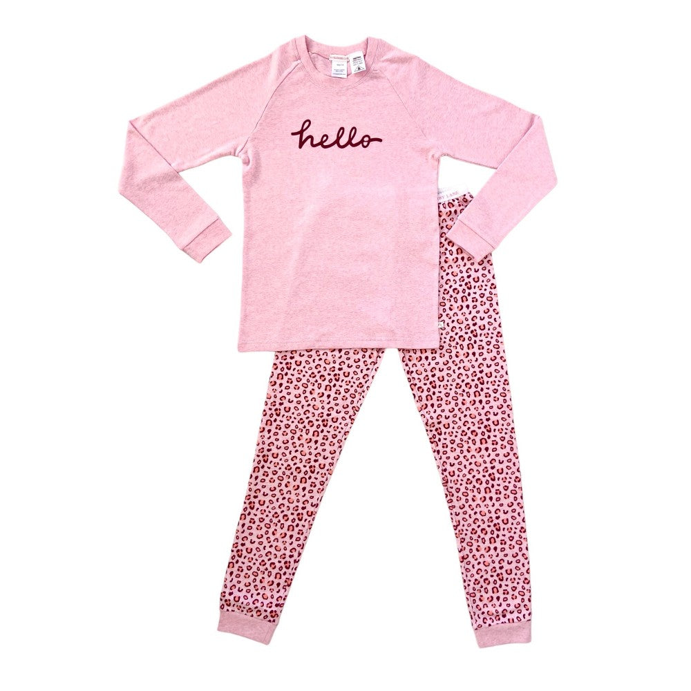 Hello! Simple, comfy & classic! Featuring our popular 100% super soft cotton top with a cute Hello print across the chest. Contrast Pink Leopard print fitted pants. Perfect for a good nights sleep and lounging around on a Winters day. A perfect gift for the teen girl. |