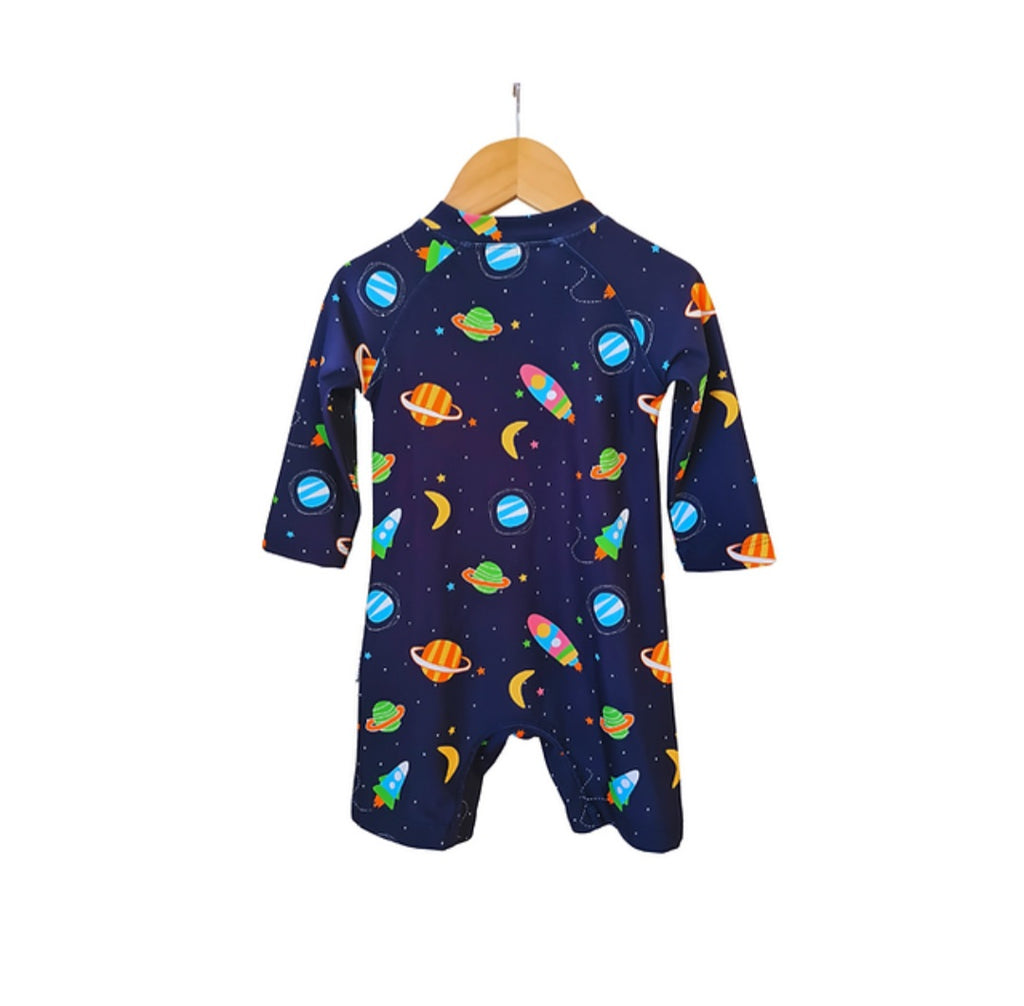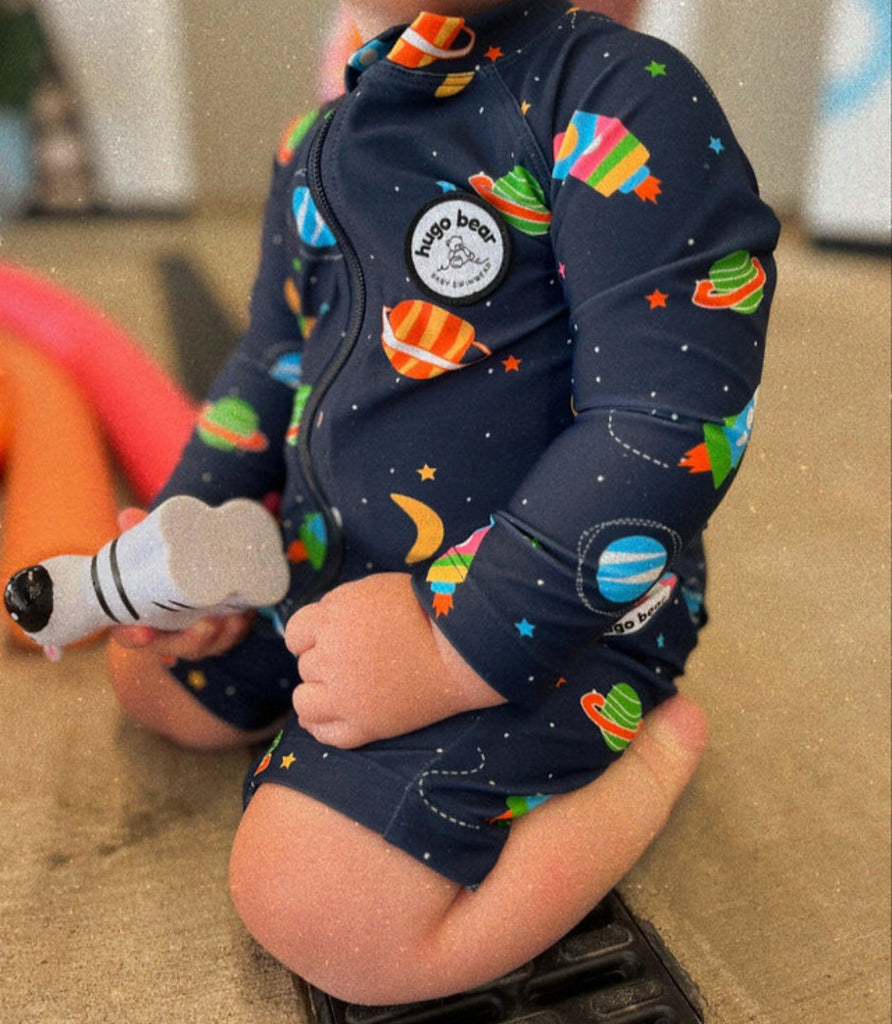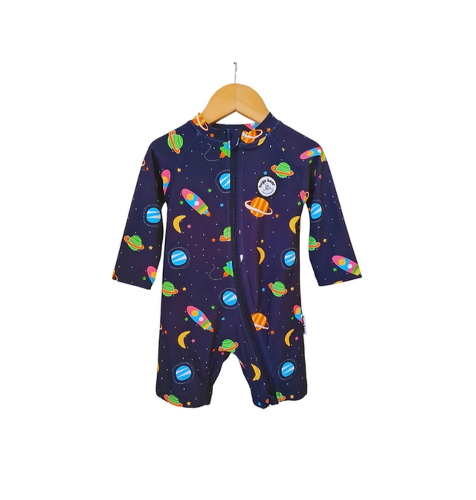 The 'Oliver' baby/toddler swimsuit is the perfect combination of style and sun protection for your little one. Made with chlorine-resistant and durable fabric, this swimsuit is designed to maintain its vibrant colors even after multiple washes. With UPF50+ protection, you can rest assured that your baby is shielded from harmful UV rays. The long sleeve, half leg design provides extra coverage, while the full-length zip at the front makes getting in and out of this swimsuit a breeze. Plus, the adorable planet themed print adds a playful touch to this must-have summer essential. Keep your little one safe and stylish at the beach or pool with the Oliver Baby/Toddler Swimsuit.