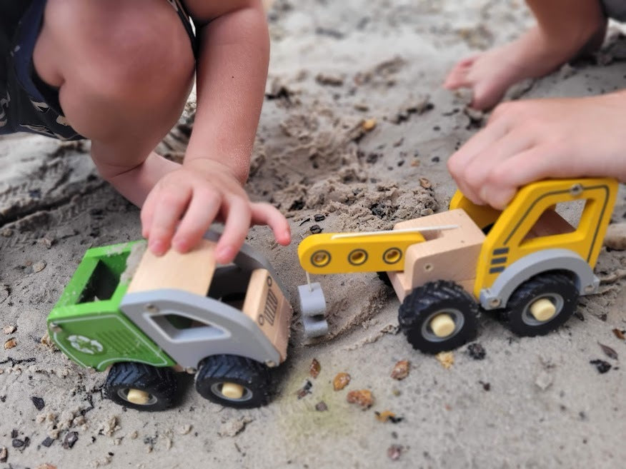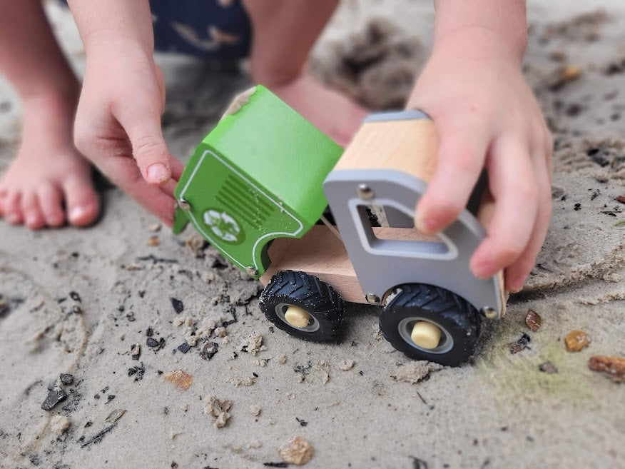 The best day of the week is rubbish day, because then we get to see the recycle truck! This sturdy wooden recycle truck features rubber wheels to protect surfaces and will put up with the rough and tumble of child's play. Made to a high quality finish, this truck is made with natural beech wood and non-toxic paint.