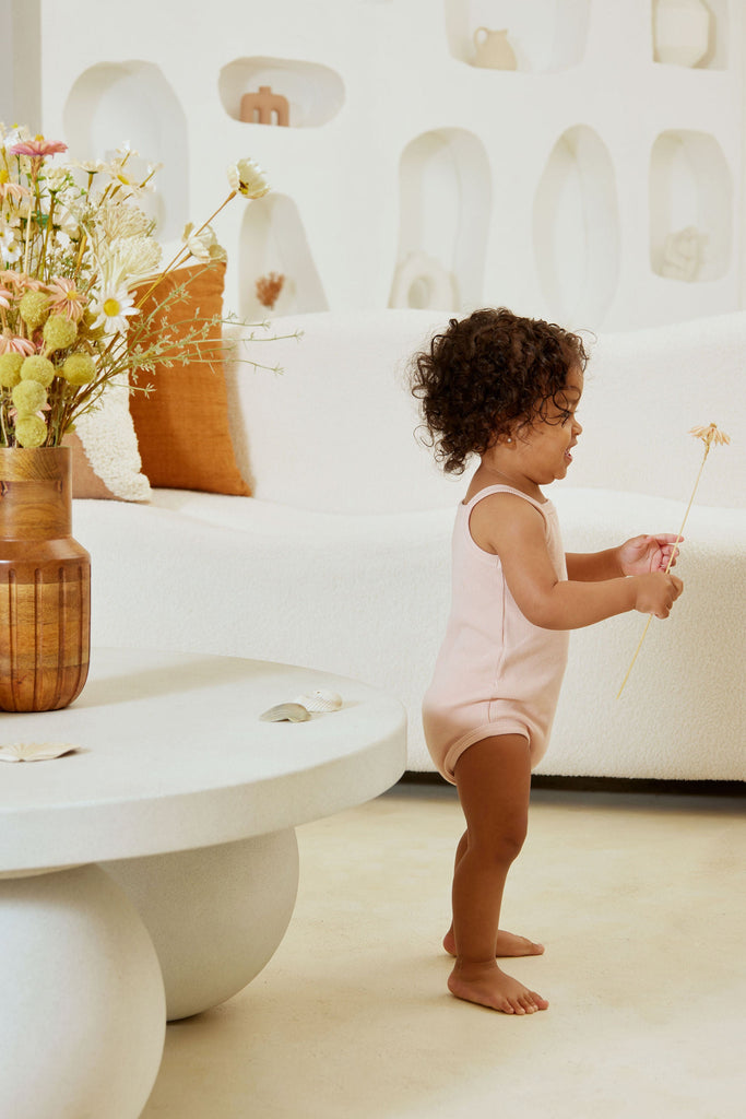 Introducing our Blossom Rib Bodysuit! Made from soft and stretchy ribbed fabric in a pastel pink colourway, this bodysuit is a great basic for your wardrobe. Perfect to wear on its own or layered under our rompers.