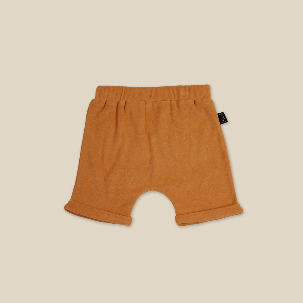 A cute new shorts shape for little ones. These basic shorts are plain Clay terry towelling to match your KaPow tees. The clay colour and the terry towelling fabric create a retro feel. The farbric has stretch to it for running and playing in. Cute pocket detail at the back and elasticated waist and cuffed hem. Designed in Melbourne, Made Ethically in China. Our garments now comes packaged in Compostable, reusable bags