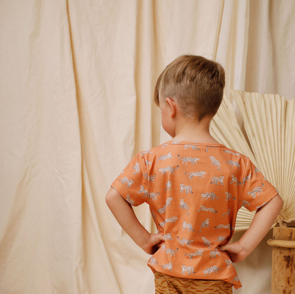 Kapow's classic drop back tee has been a best seller for years. This yardage print tee features little leopards on a rust background. The back features a dipped hem. Designed in Melbourne, Made Ethically in China. Our garments now comes packaged in Compostable, reusable bags.