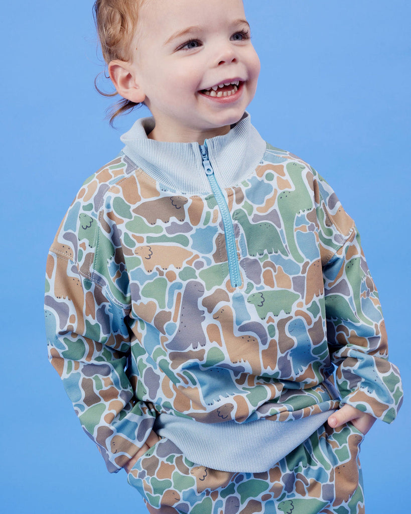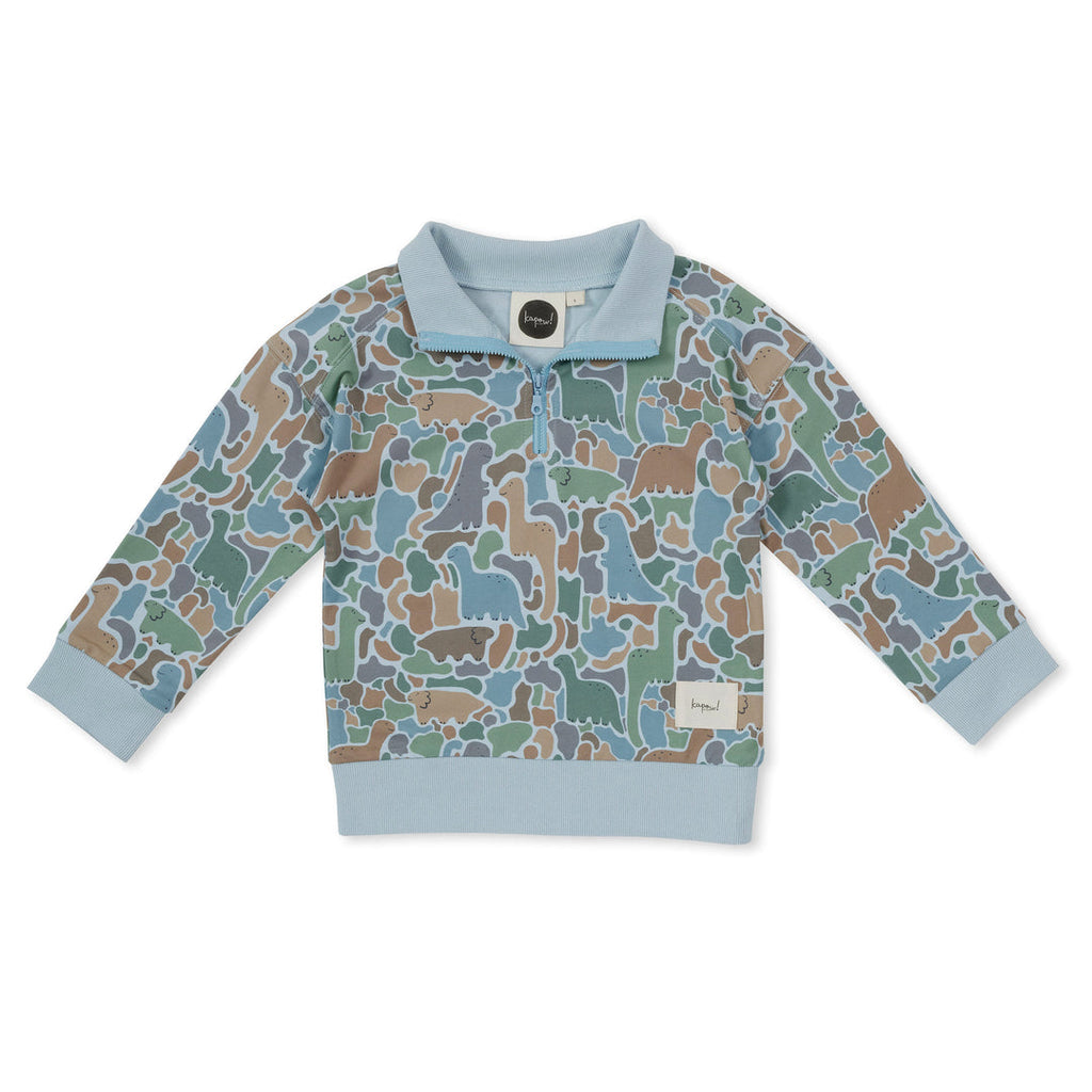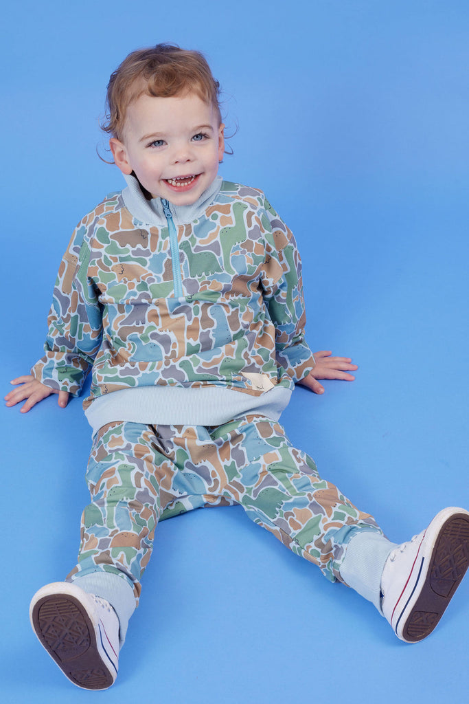 Stay warm and stylish with our Dino-saw Half Zip Sweater! Perfect for outdoor adventures or cozy nights in, this sweater will keep you comfortable and trendy. Featuring a convenient half zip design and a Dinosaur Camoflage print, it's a must-have for any wardrobe. Don't miss out on this versatile and playful piece! French terry fabric. Designed in Melbourne, Australia, made ethically and slowly in China.