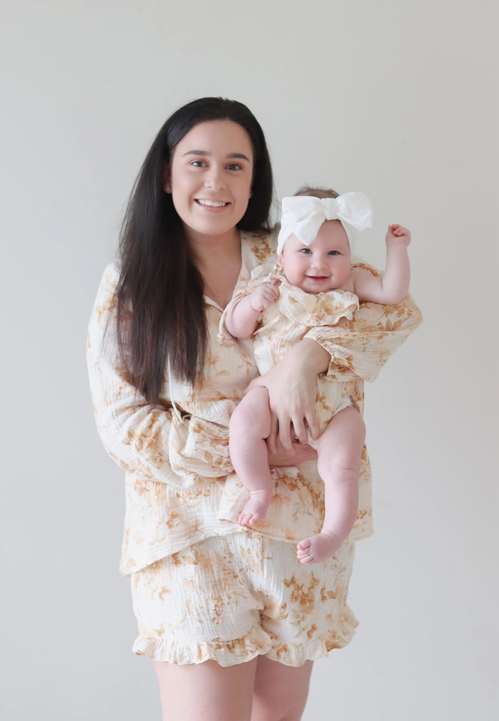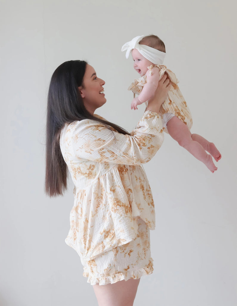 The Gardenia print is a bohemian floral fabric in golden hues on soft cheesecloth 100% cotton.
