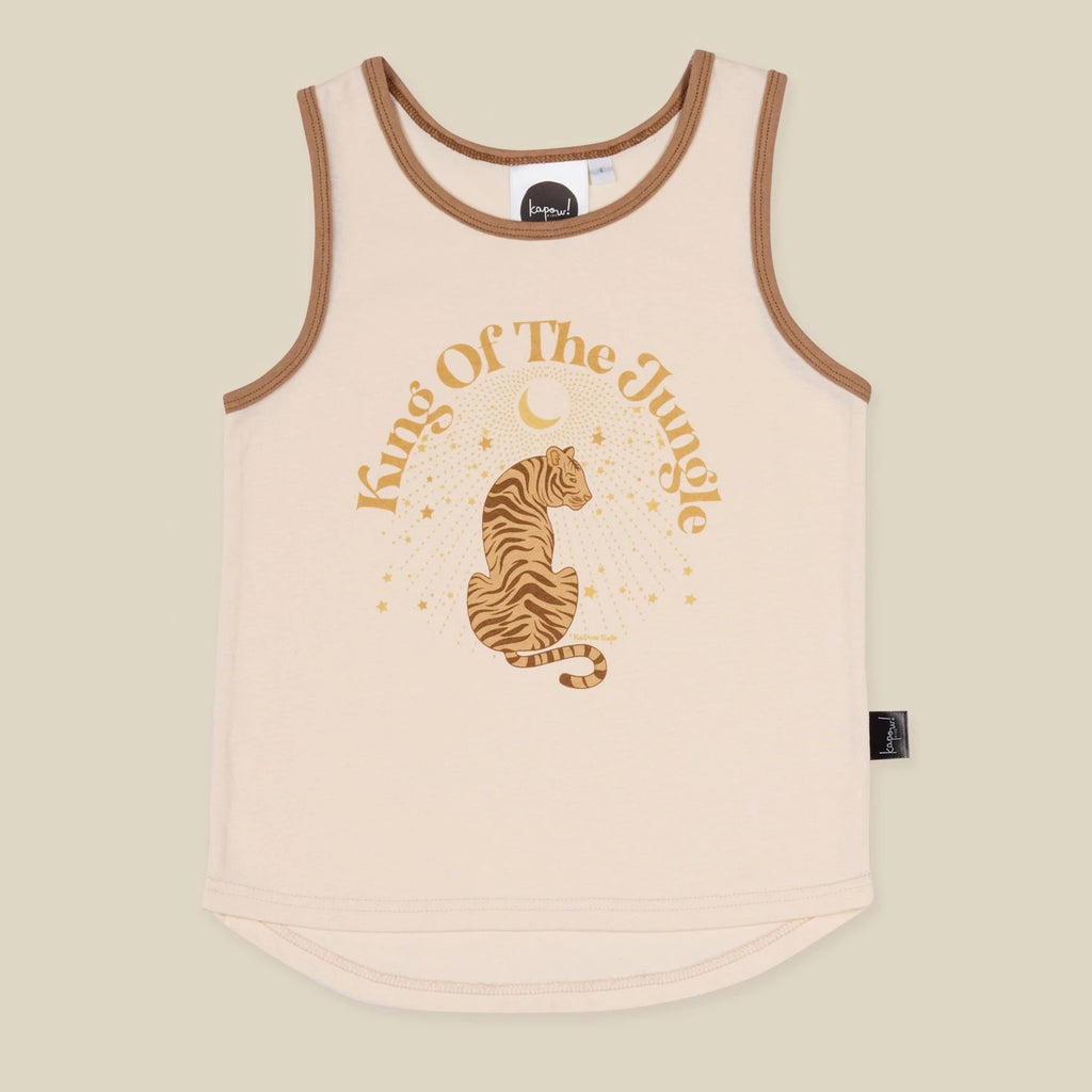 Exclusive King of the Jungle Placement print in golden / beige tones on a sand coloured base fabric. A retro feel tank with contrasting trim.