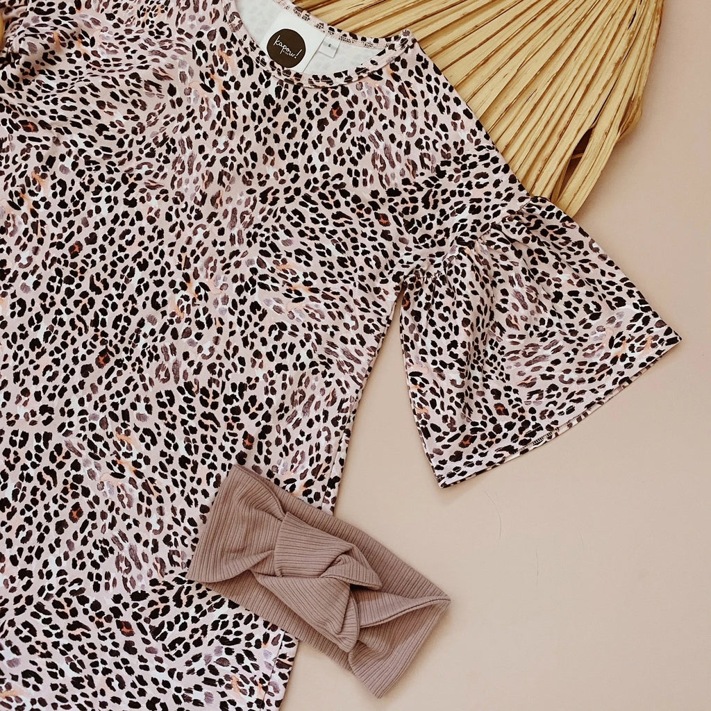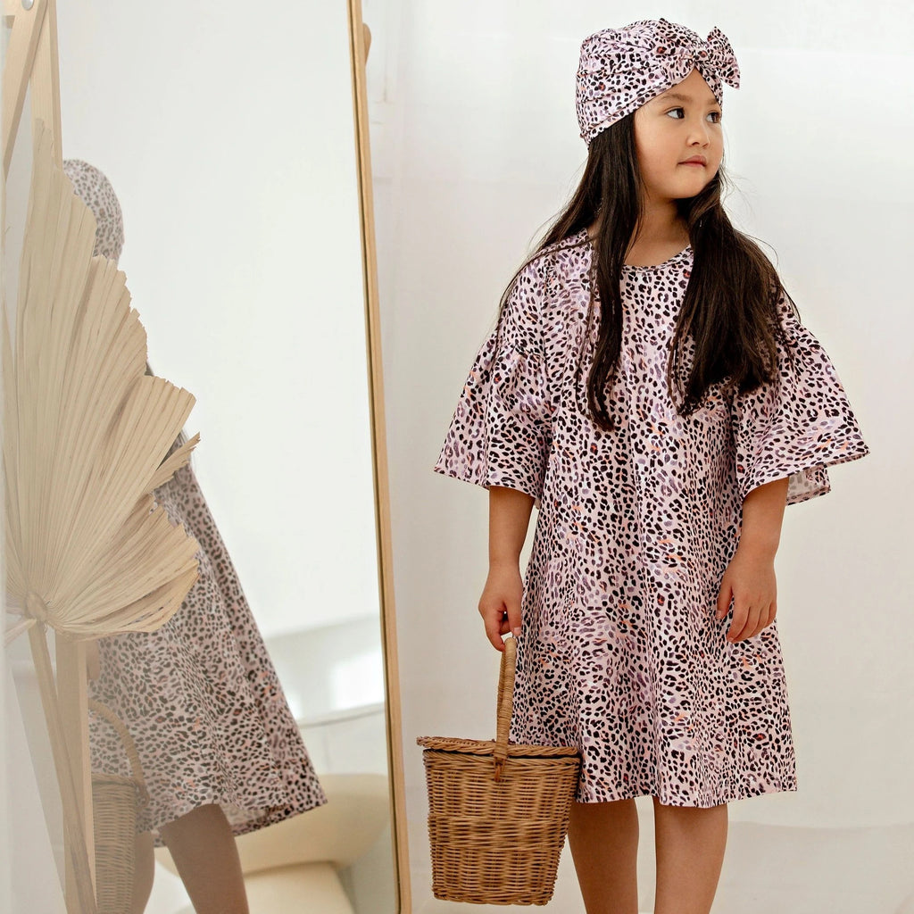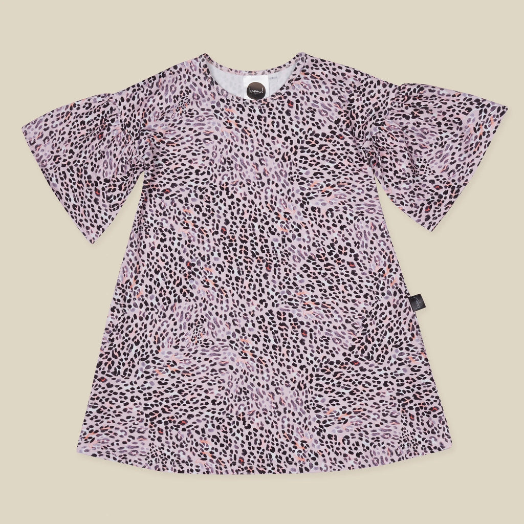 A beautiful lilac leopard print, exclusive to Kapow Kids. Stretchy and soft 97% cotton, 3% spandex. The Puff dress is a new shape this season that features a loose fitting style and accentuated sleeves for drama. Its an easy pull on style thats really comfy to wear. All of the Kapow range is designed in Melbourne, Australia and manufactured ethically and slowly in our small factory in China. The garments come packaged in cornflower starch bags that break down easily in the compost.