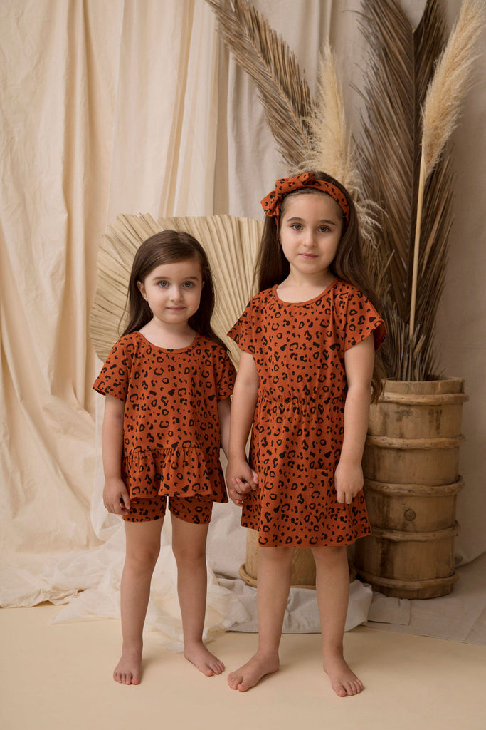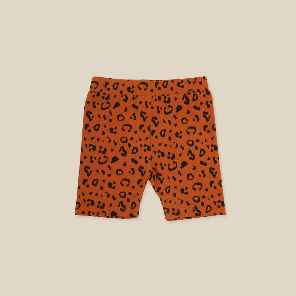 Cool little bike shorts for girls. Rust stretchy jersey with charcoal leopard print. Designed in Melbourne, Made Ethically in China. Our garments now comes packaged in Compostable, reusable bags.