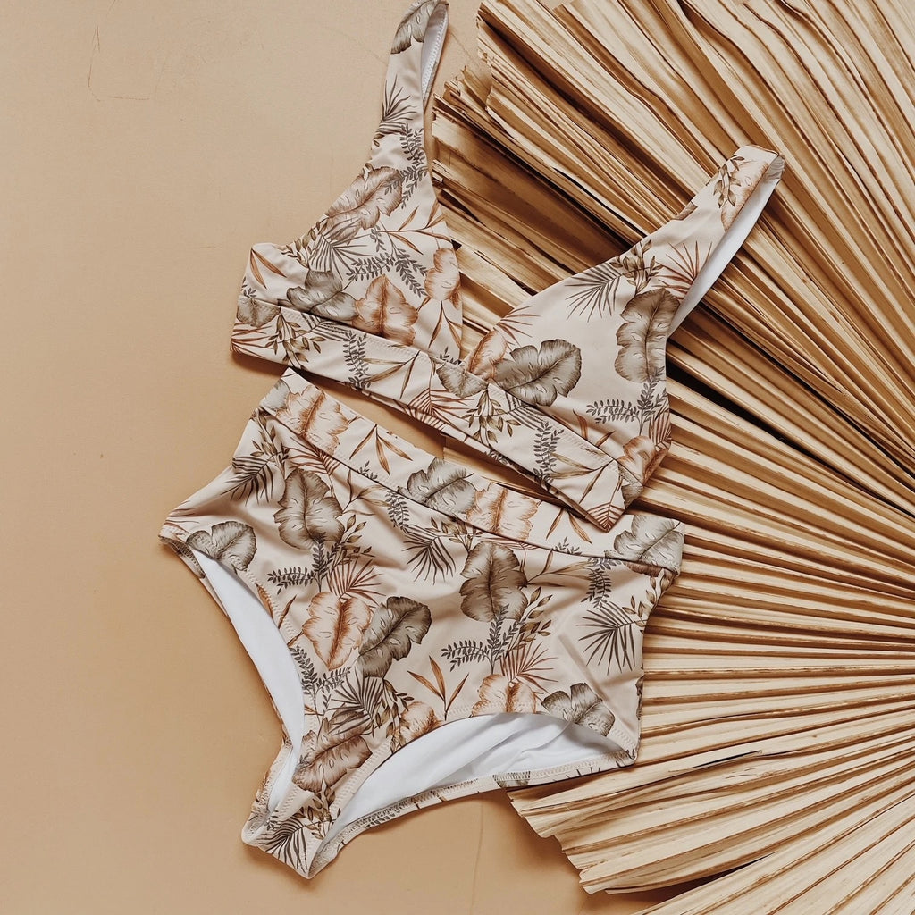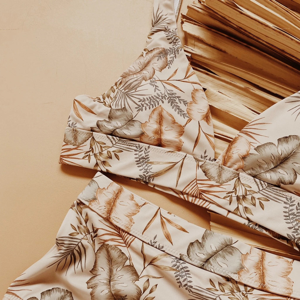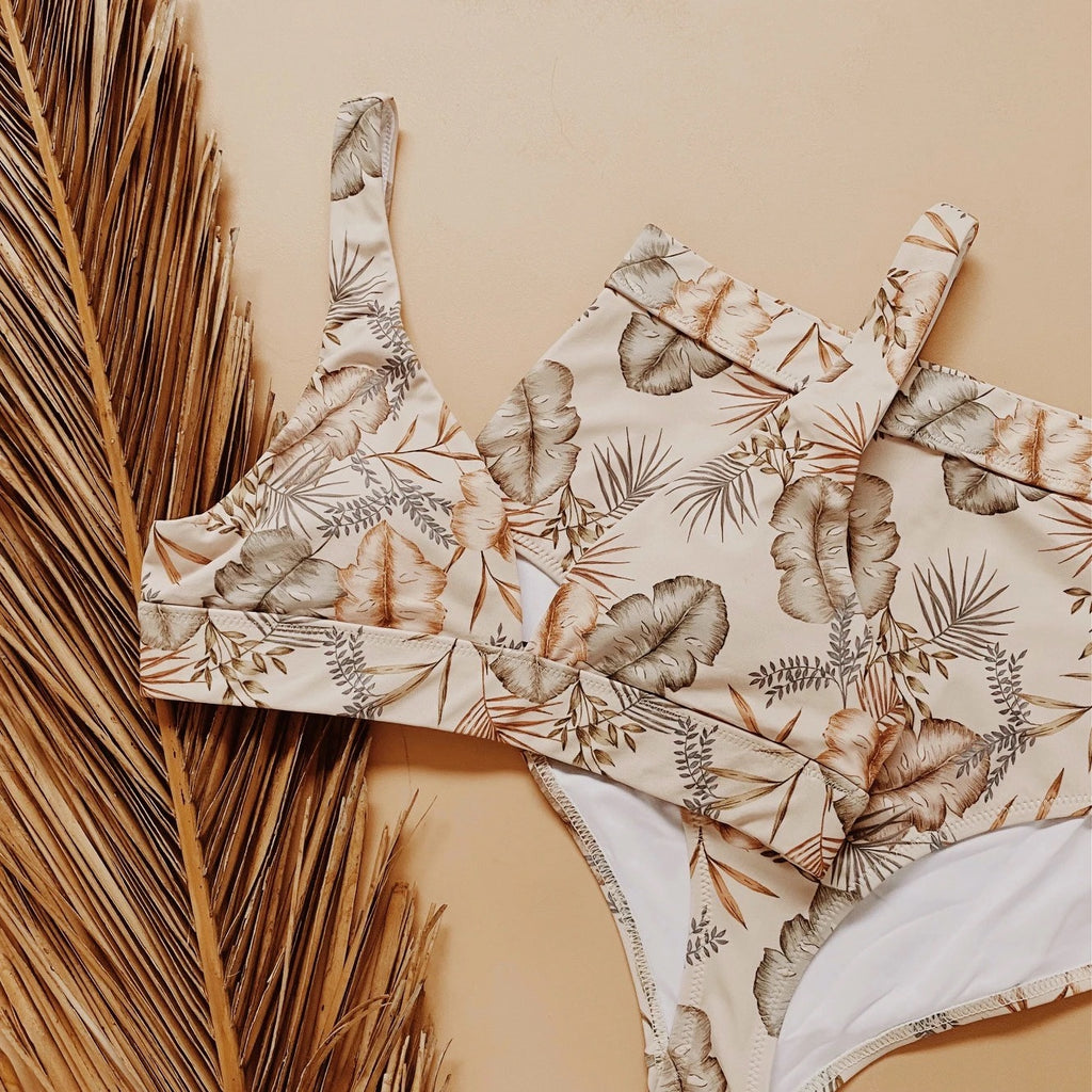 Exclusive tropical palm leaf digital print 'Sundance' in muted olive green and beige tones.