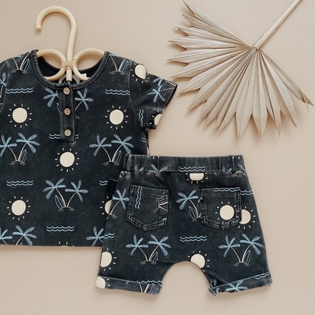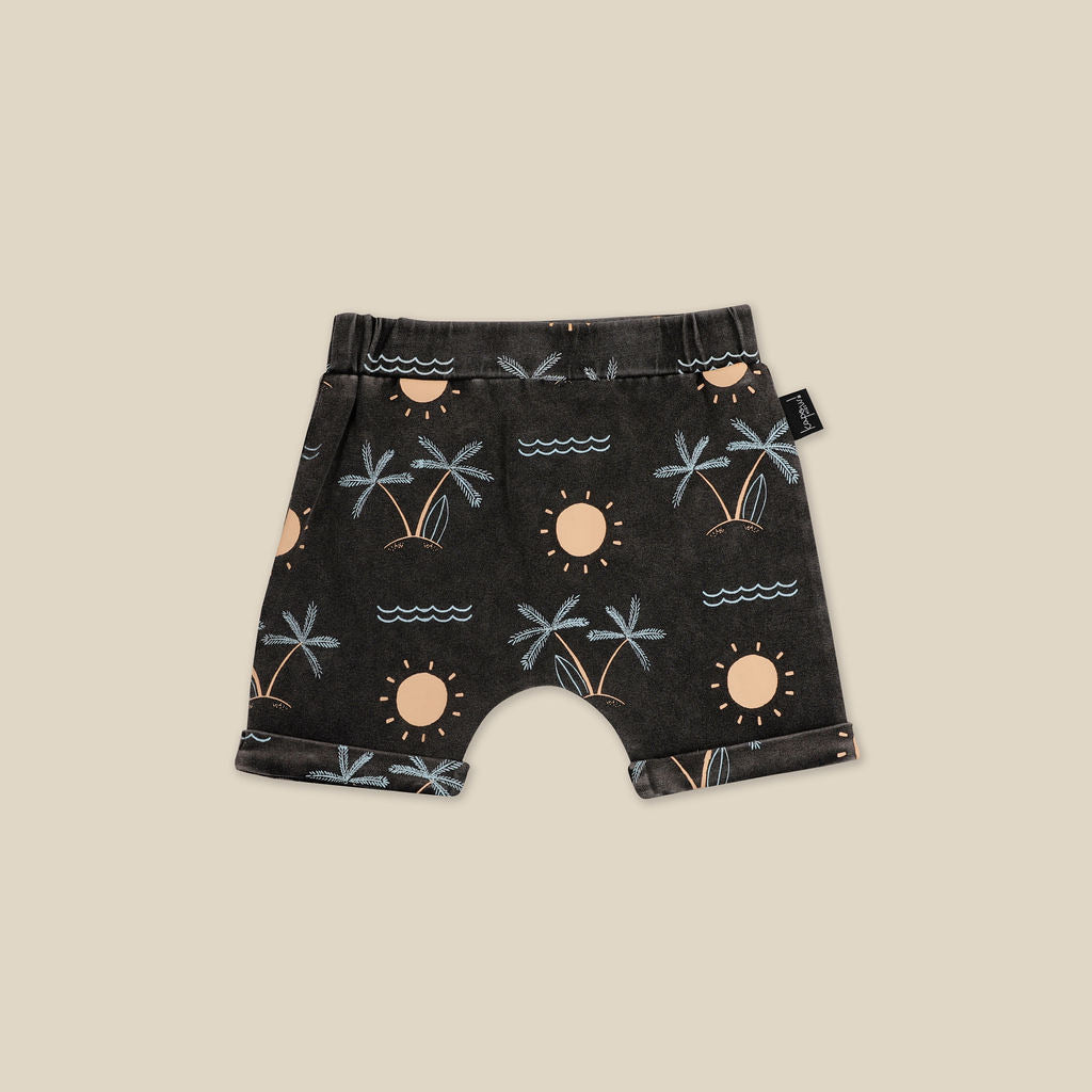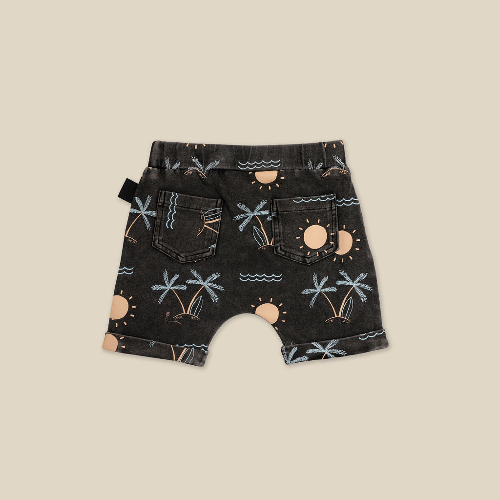 A cute new shorts shape for little ones. These little shorts feature our Exclusive Sunseeker palm tree print on acid wash jersey. The washed out fabric creates a retro feel. The farbric has stretch to it for running and playing in. Cute pocket detail at the back and elasticated waist and cuffed hem. Designed in Melbourne, Made Ethically in China. Our garments now comes packaged in Compostable, reusable bags.