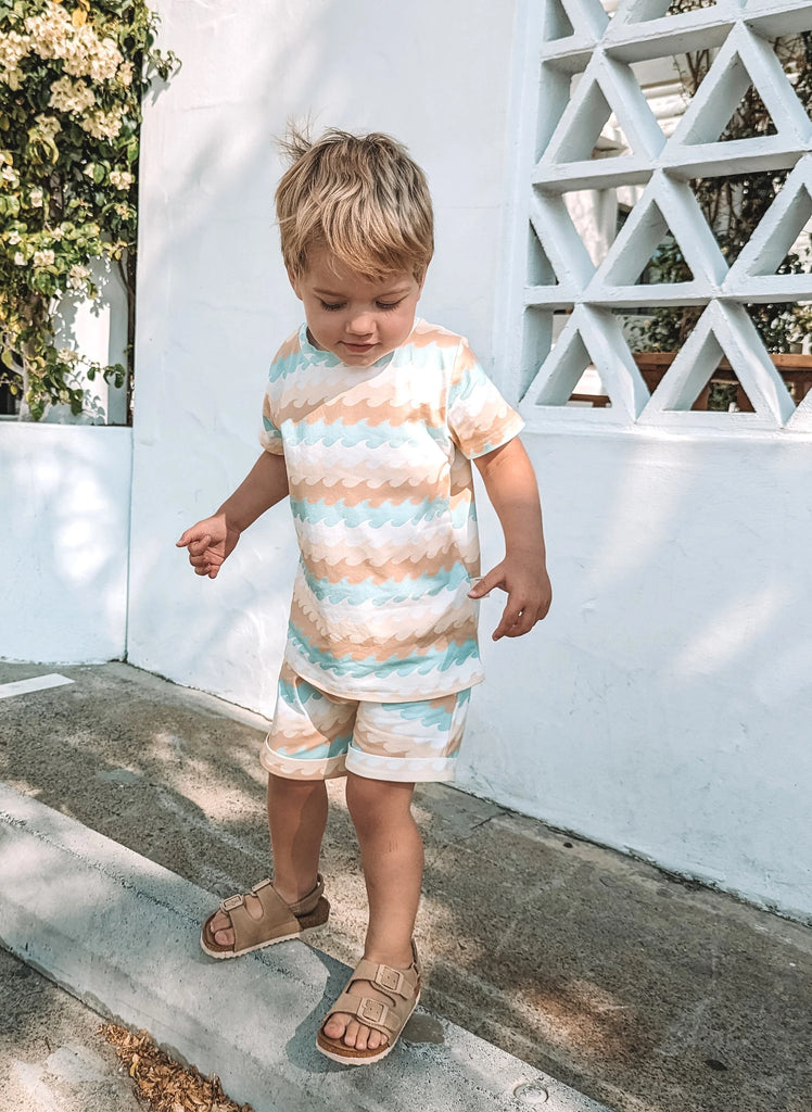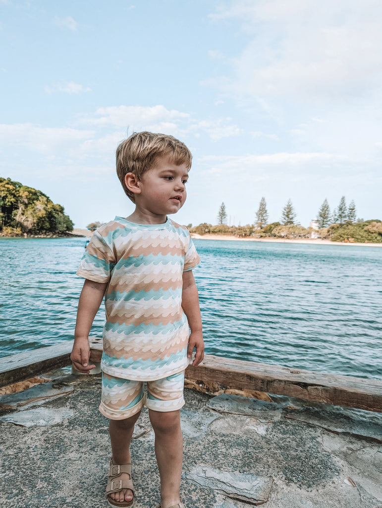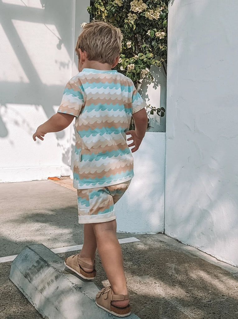 Look your beachy best with these Surfs Up Shorts! Featuring a stylish wave pattern in a variety of blue hues, these lightweight cotton-jersey shorts keep you comfy with their elastic waist and adjustable tie. Plus, the front pocket and rolled cuffs give them an extra edge.