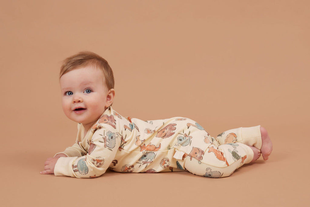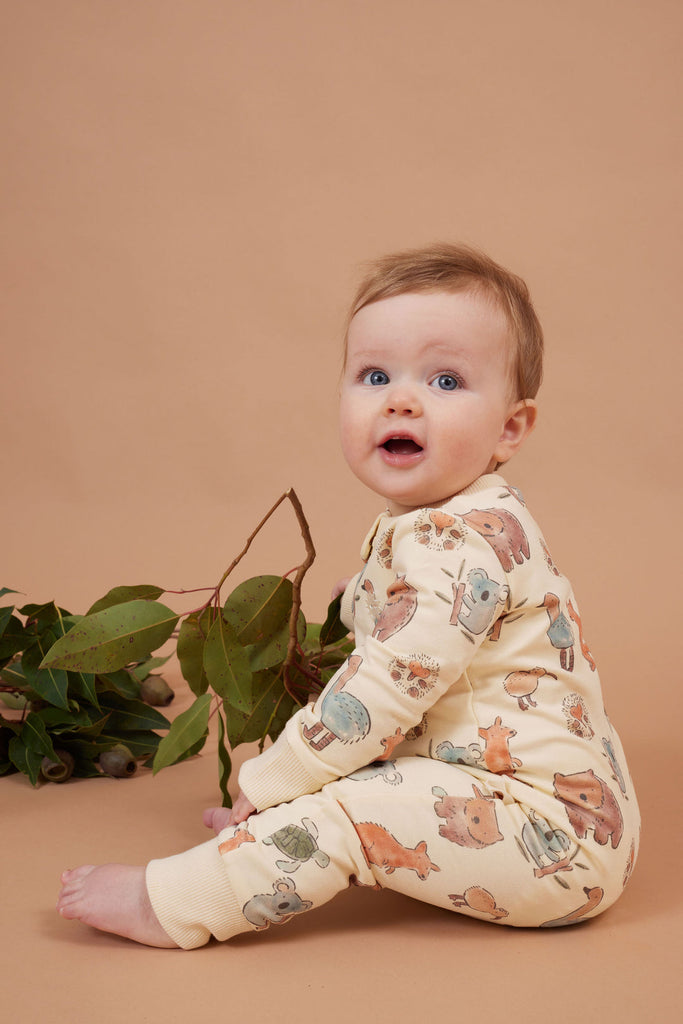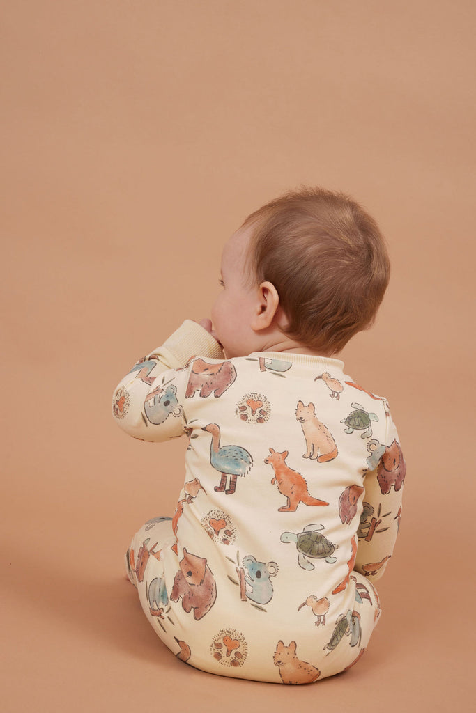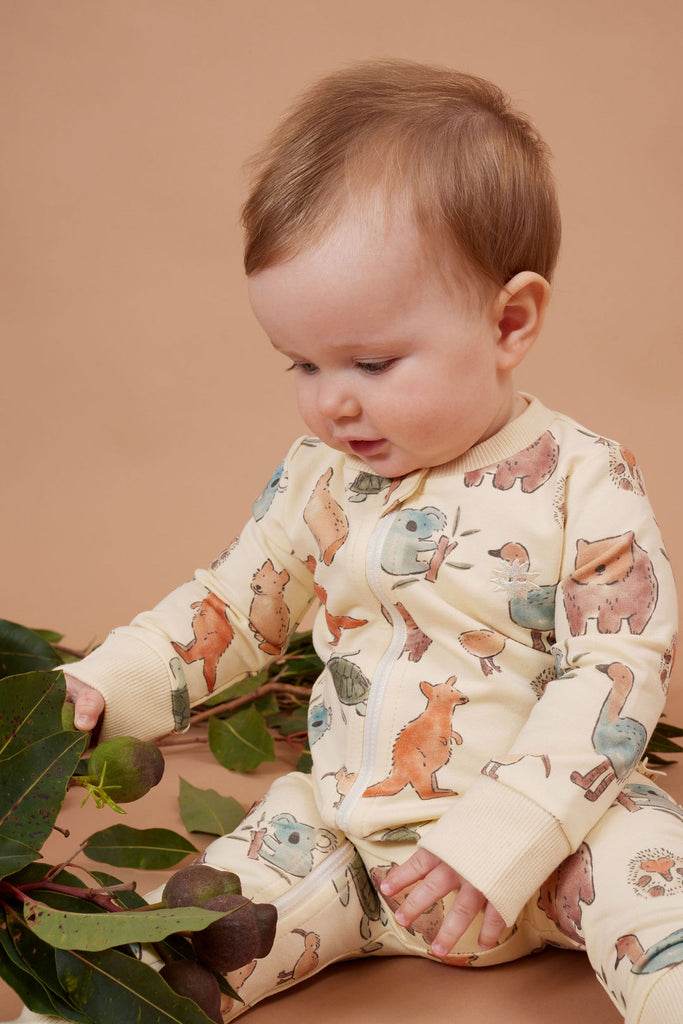 Get ready for an adventure with the Wild Wonders Zip All in one! This all-in-one outfit features adorable Aussie animals and a convenient 2-way zip closure. Perfect for exploring the great outdoors, this zip all in one will keep your little one warm and comfy while they discover the wonders of the wild. Made from soft 95% cotton and 5% spandex french terry. Designed in Melbourne, Australia, made ethically and slowly in China.