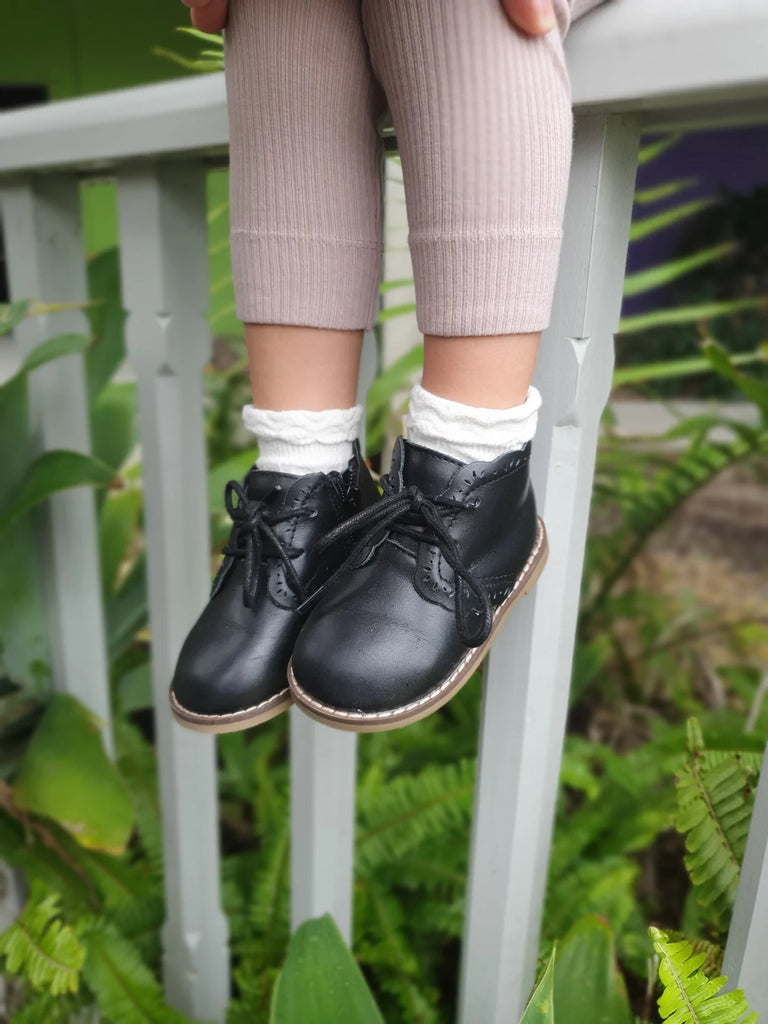 These black boots are made with a traditional leather and are light, yet comfortable.