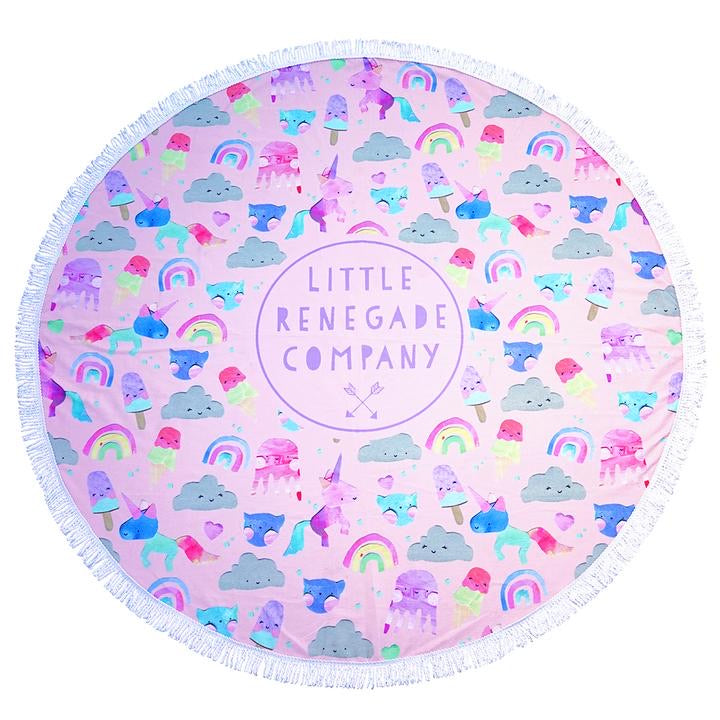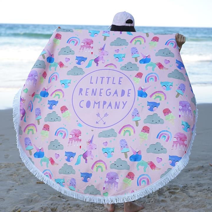 This Unicorn Friends design was a collaboration between Little Renegade Company and Australian artist Laura Blythman. It features super cute unicorns, rainbow, iceblocks, jellyfish, clouds and cats. It is topped off with white fringing. Like to match? We also have a Unicorn Friends Cap and Unicorn Friends bags too!