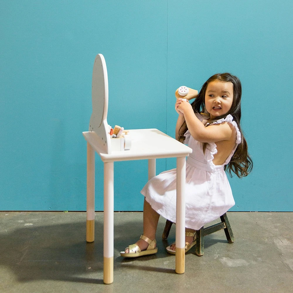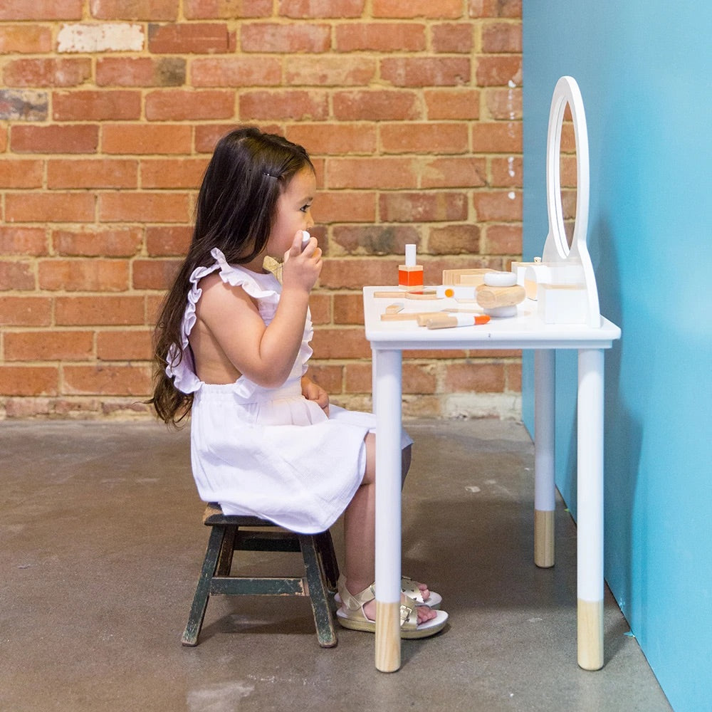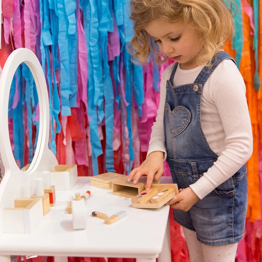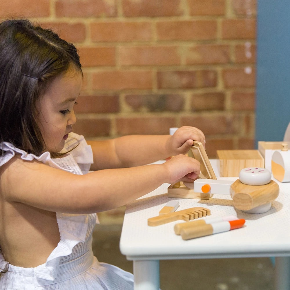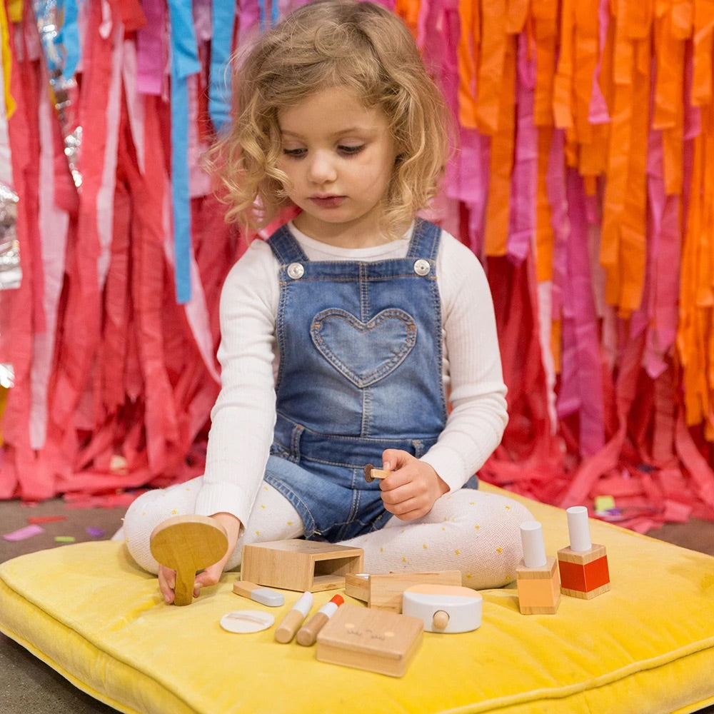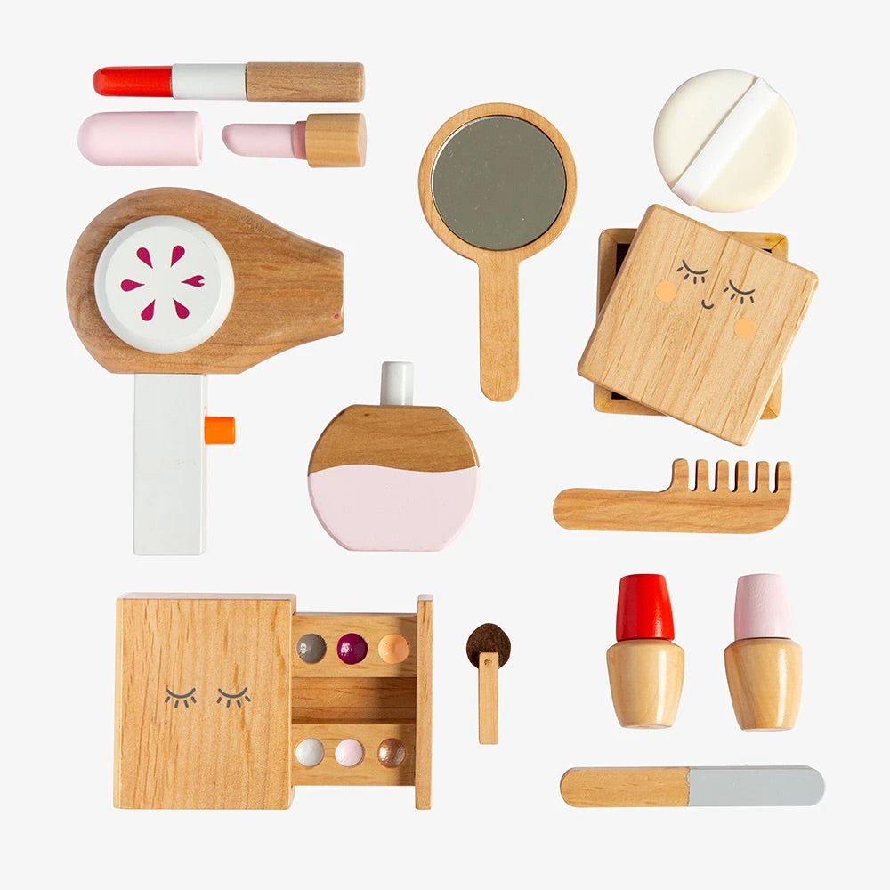 We’ve created this beautiful play beauty kit as a keepsake toy that will last through all of your children’s years of playing dress-ups, shops, and Mum’s and Dad’s. It’s made from timber instead of plastic, and is designed to be a timeless addition to their toy collection that invites imagination into your home, and into their play.