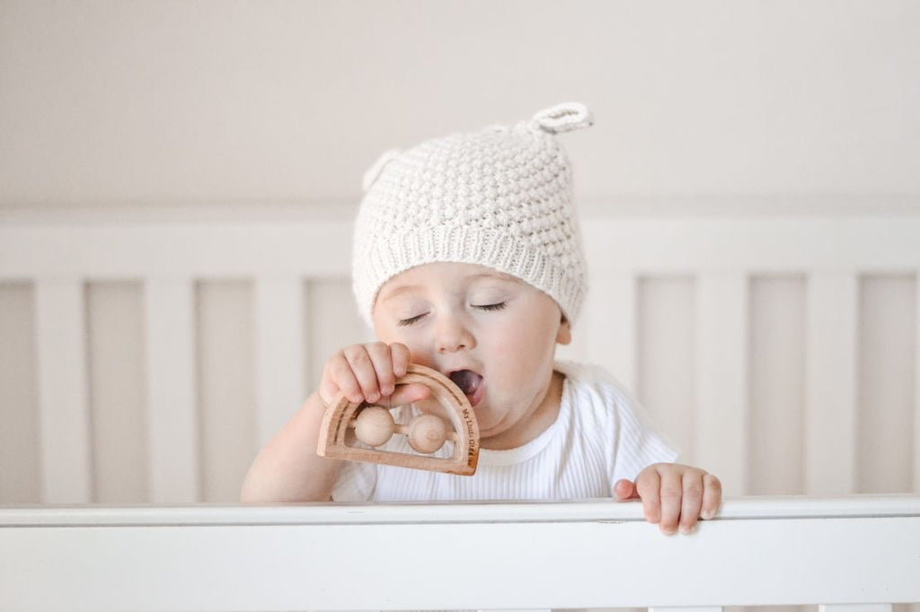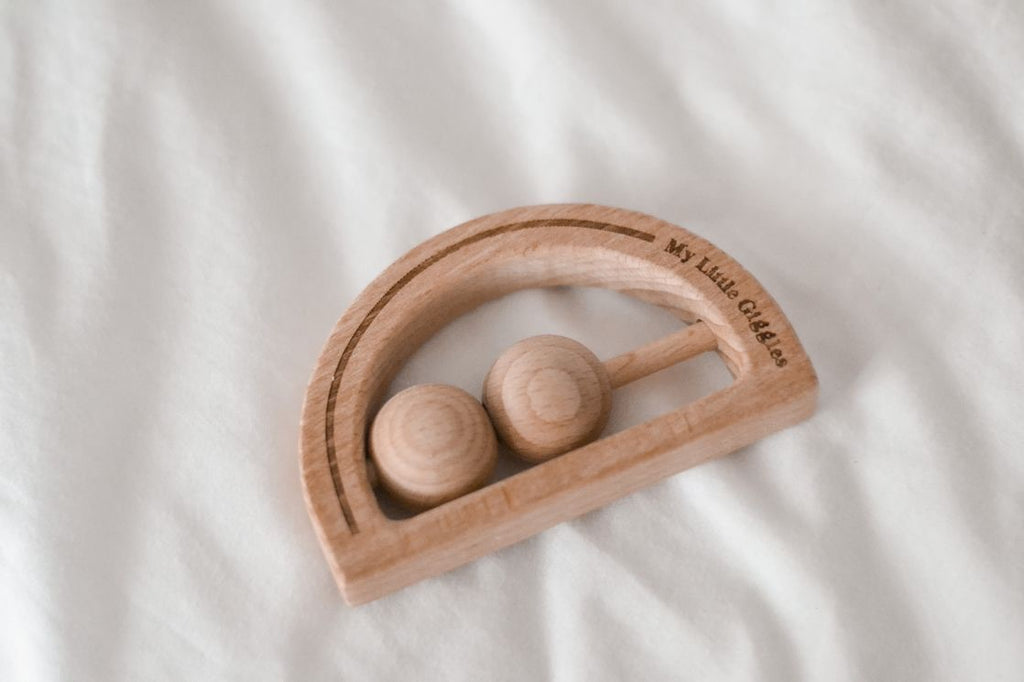 Our new Rainbow Rattles are made from beautiful natural Beech Wood. Hand sanded so they are silky smooth, our new rainbow design has two large beech beads for your little ones to spin, move and shake while listening to the soft rattle sounds.
