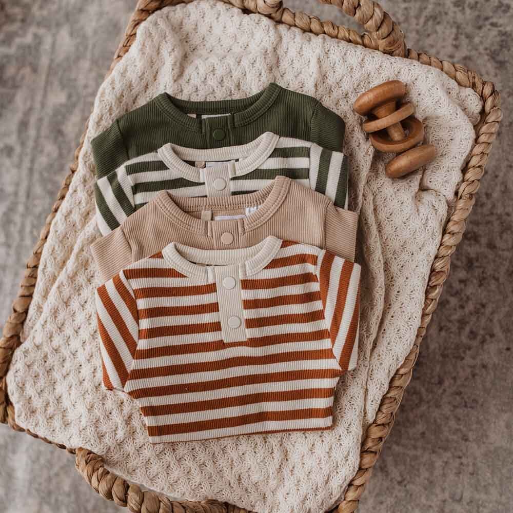 Snuggle Hunny organic growsuits are made for babies and toddlers and our exclusive Biscuit Stripe ribbed cotton design is a beautiful colour great for boys and girls.