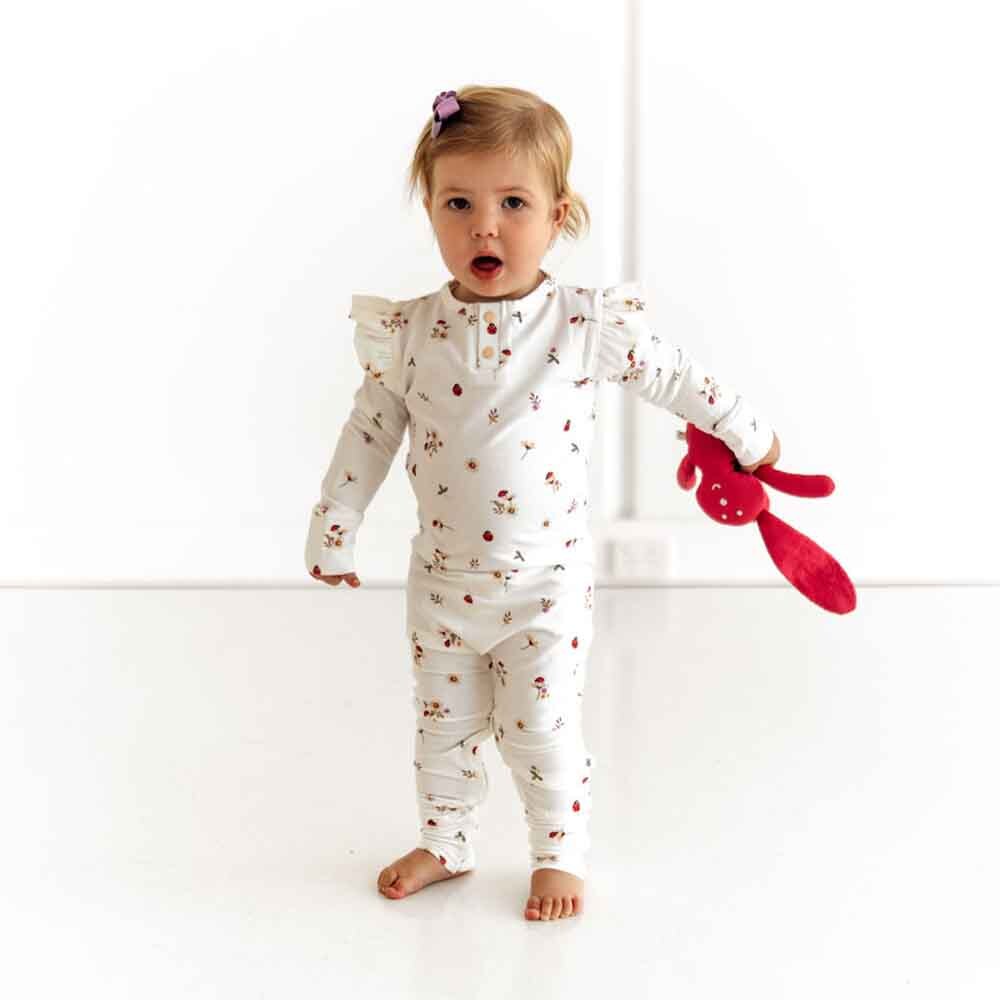 Snuggle Hunny organic growsuits are made for babies and toddlers and our exclusive Ladybug print is delicate and beautiful. We also feature a frill on the shoulders for added detail.