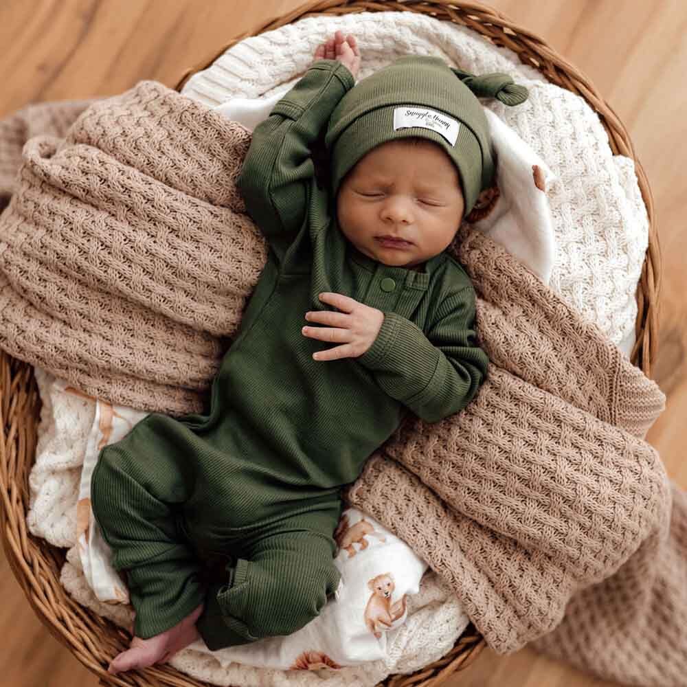 Snuggle Hunny organic growsuits are made for babies and toddlers and our exclusive Olive ribbed cotton is a beautiful neutral colour great for boys and girls.