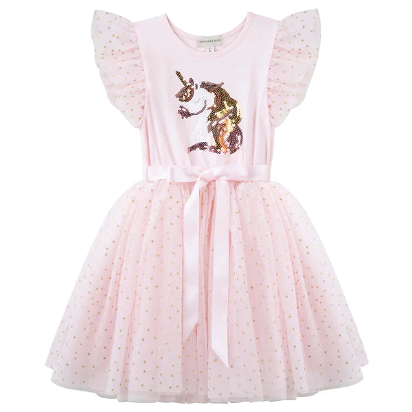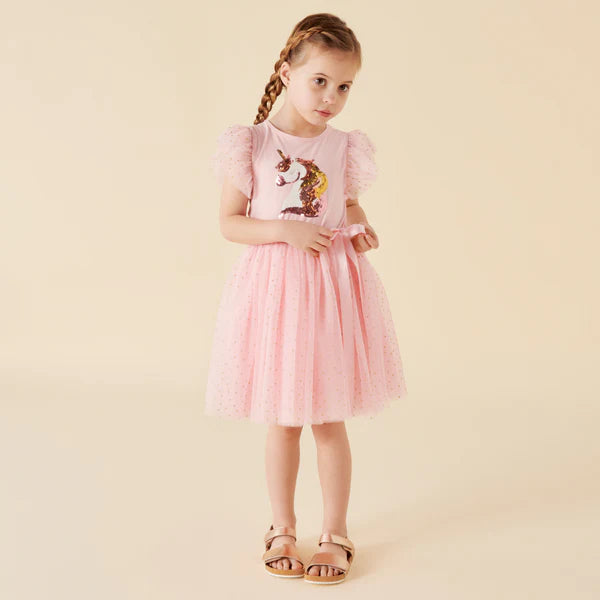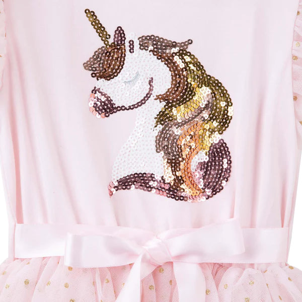 Make her big day just perfect with our Unicorn Sequin S/S Tutu Dress, featuring our exclusive unicorn sequin design, complimented by matching satin bow, gold sparkle tulle skirt and shoulder frill. Perfect for your girl's next special occasion, birthday or party celebration.
