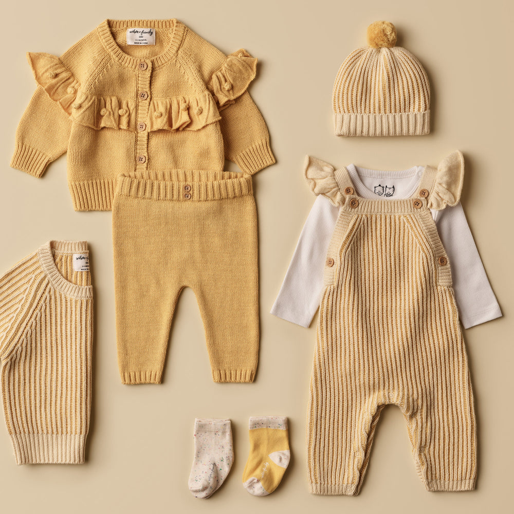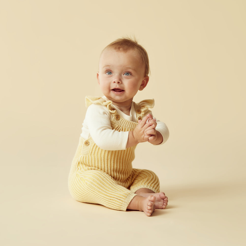 Our full length knit overall with ruffle, features button up shoulder straps and a snap leg opening for quick and easy nappy changes. Made from a beautiful blend of Cotton, Bamboo and Wool it's a style you'll want in every colour! Pair back with an organic long sleeve top for an adorable winter layered look.