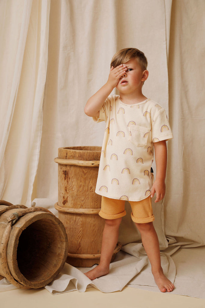 Kapow's classic drop back tee has been a best seller for years. This retro style tee is made from terry towelling in eggshell with a cool  vintage washed out rainbow yardage print. The back features a dipped hem and the front, a cute pocket. Designed in Melbourne, Made Ethically in China. Our garments now comes packaged in Compostable, reusable bags.