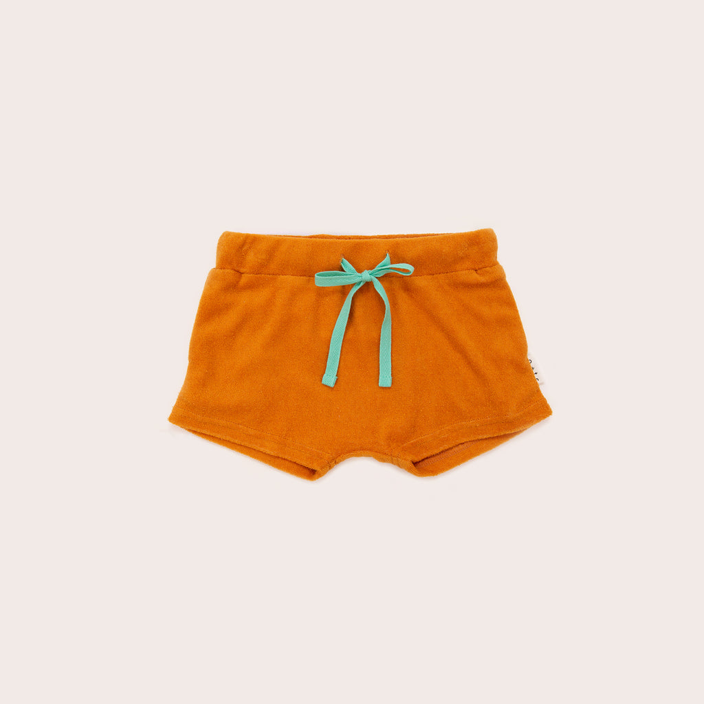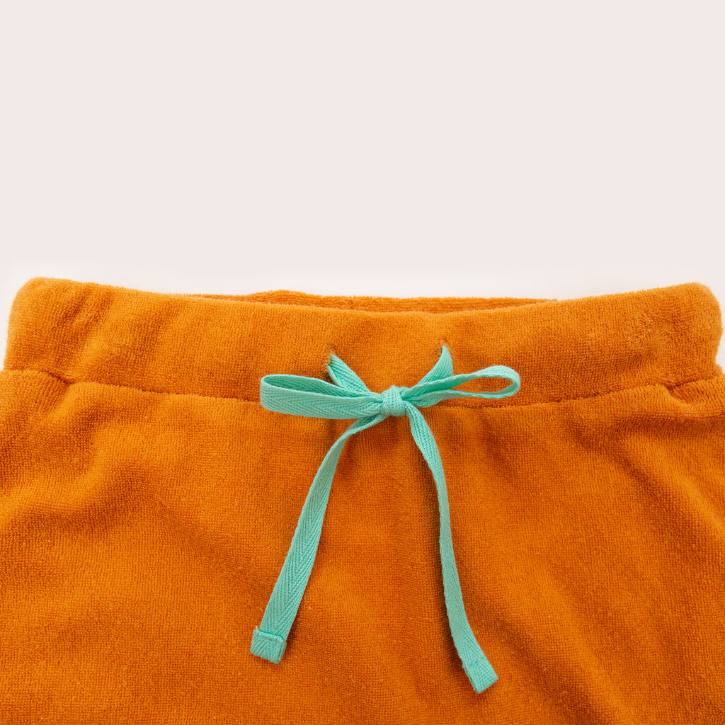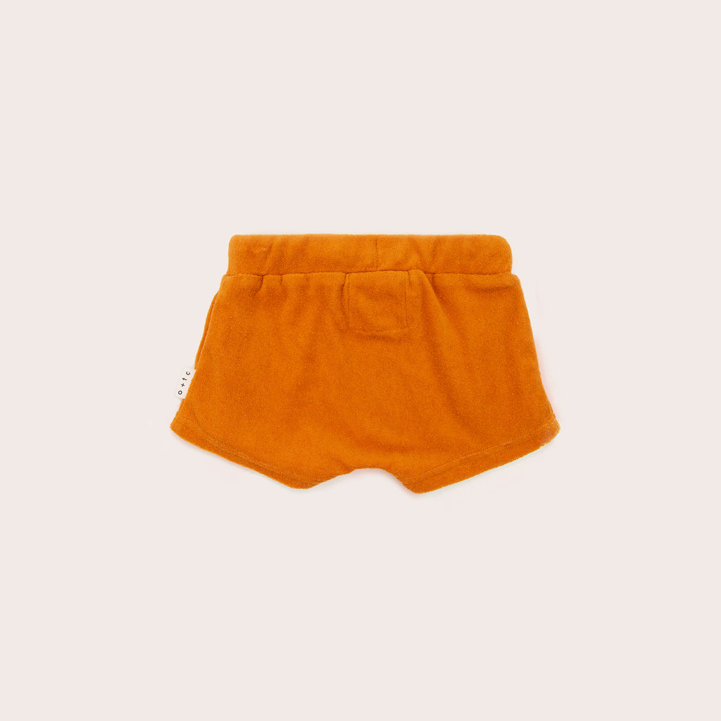 Burnt orange shorts, fluffy textured terry on the outside and smooth on the inside.
