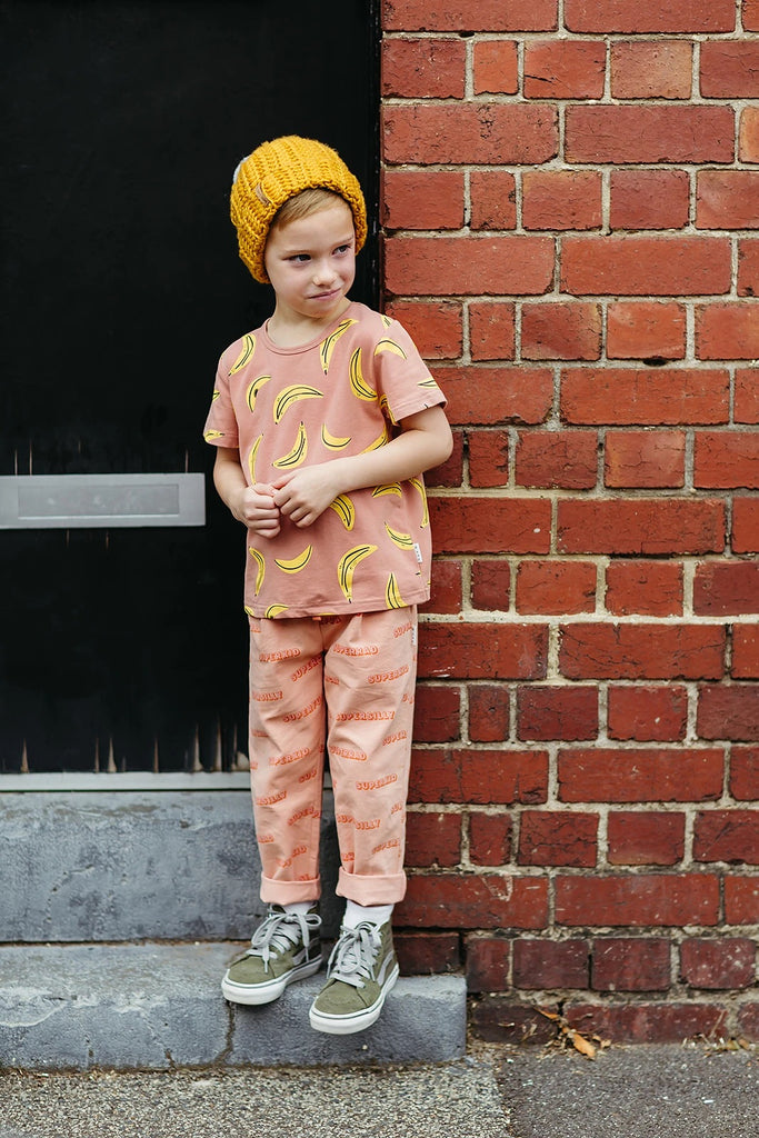 Soft dusk tee with a bright repeating print. You’ll go bananas for this one.