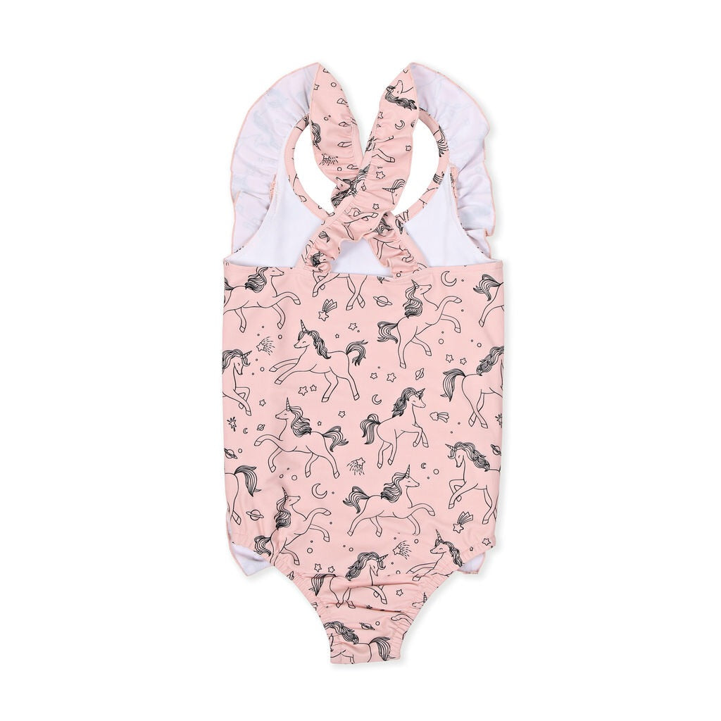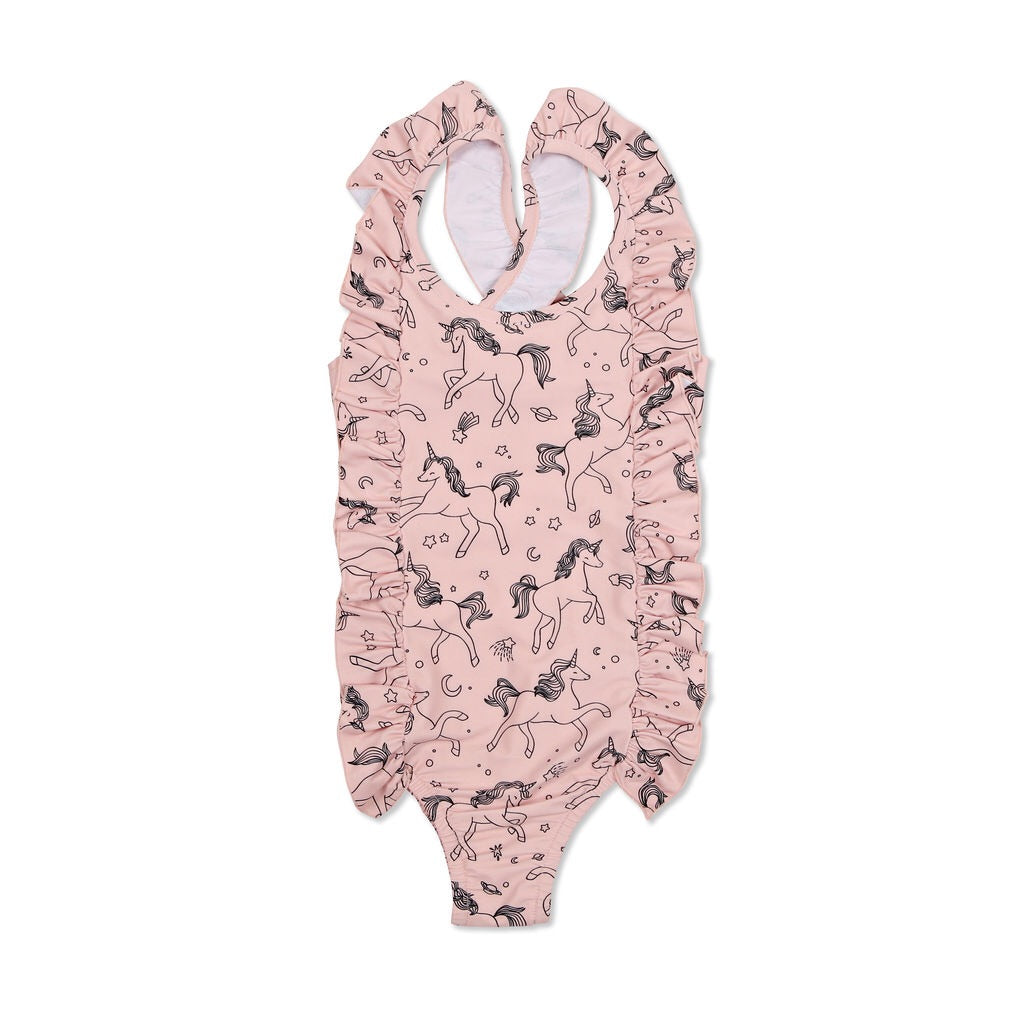 •Cloud pink base fabric with unicorn screen print in charcoal