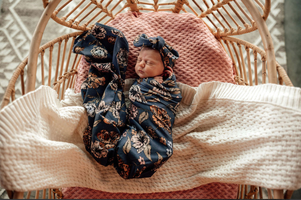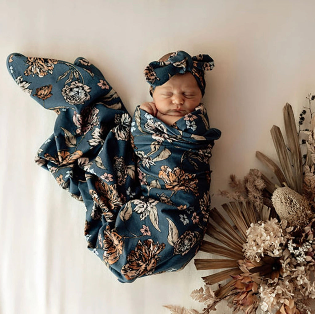 Our Cotton Jersey Wrap is soft and stretchy, it moves and stretches with baby. This wrap comes with a matching topknot.