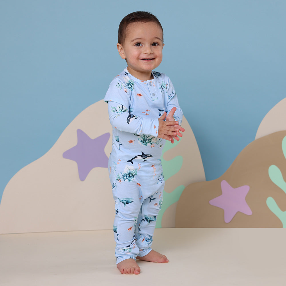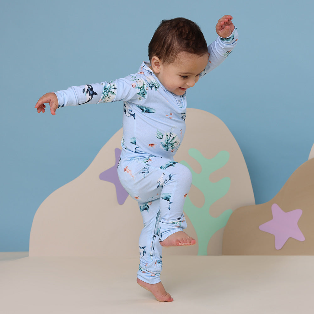This design includes a long, hidden zipper from ankle to ankle, inside the leg. This means bub’s body can stay warm while their nappy is being changed, with simple, easy access. It also means these growsuits are as easy as a T Shirt to put on bub! Scrunch them up from the bottom and pop them on over their head.
