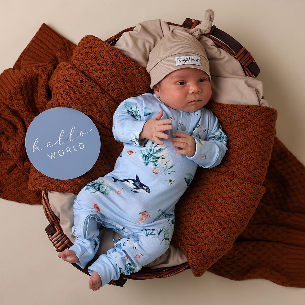 We have also included foldable hand mittens for newborn to 6 months. Hand mittens help stop little nails from scratching and also keep hands warm when the weather is cool. Bub can wear the mittens open or closed. For sizes from 6 months upwards, the mittens are replaced with a stylish cuff. Foot mittens are also an important feature and these are included on all sizes. Who doesn’t love to tuck in those little feet for bedtime to keep warm?